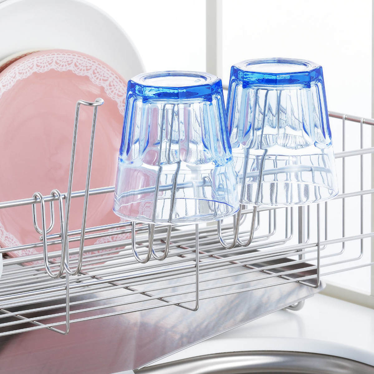 水切りかごにカスタマイズお手持ちの水切りかごに後付けして使える、ステンレス製の3連グラスホルダーです。フックで簡単に引っ掛けて、気軽に水切りかごの容量を増やせます。グラスの他に、ペットボトルやタンブラーなどの水切りにも最適です。