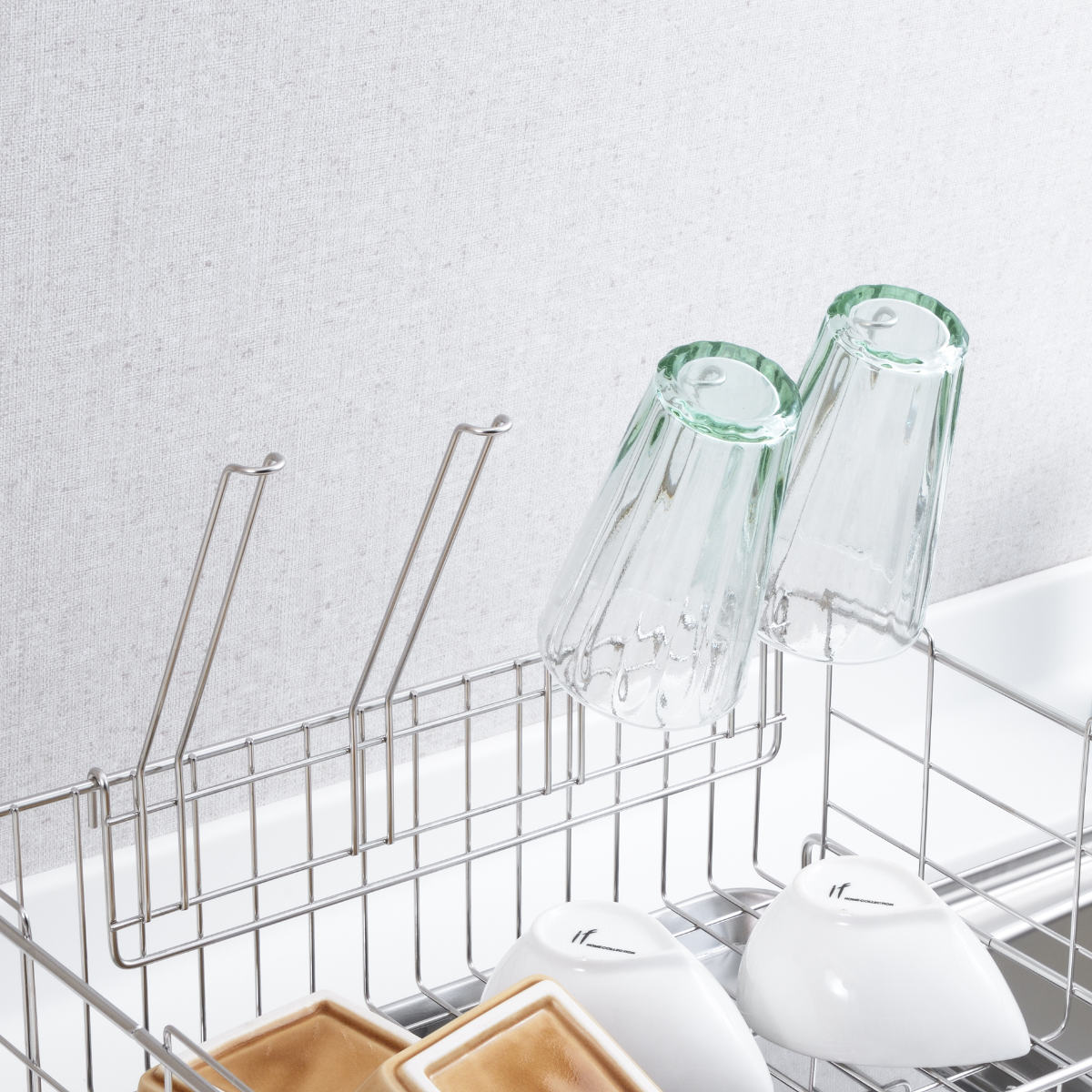 水切りかごにカスタマイズお手持ちの水切りかごに後付けして使える、ステンレス製の4連グラスホルダーです。フックで簡単に引っ掛けて、気軽に水切りかごの容量を増やせます。ホルダーは傾斜設計となっており、水滴がかご内に落ちるので周囲を汚しません。