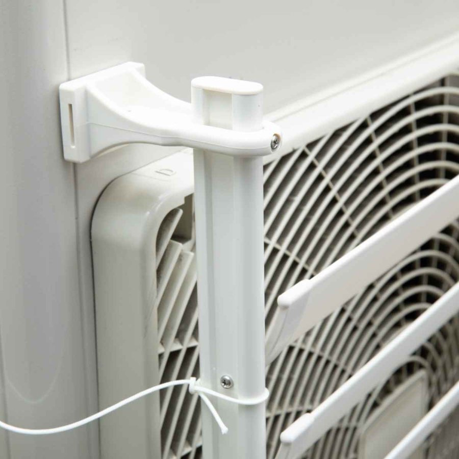 工具不要で簡単取付本体の支柱4か所に台座をはめ込んで本体に取り付けます。付属の脱落防止紐で支柱と室外機を結んで固定します。