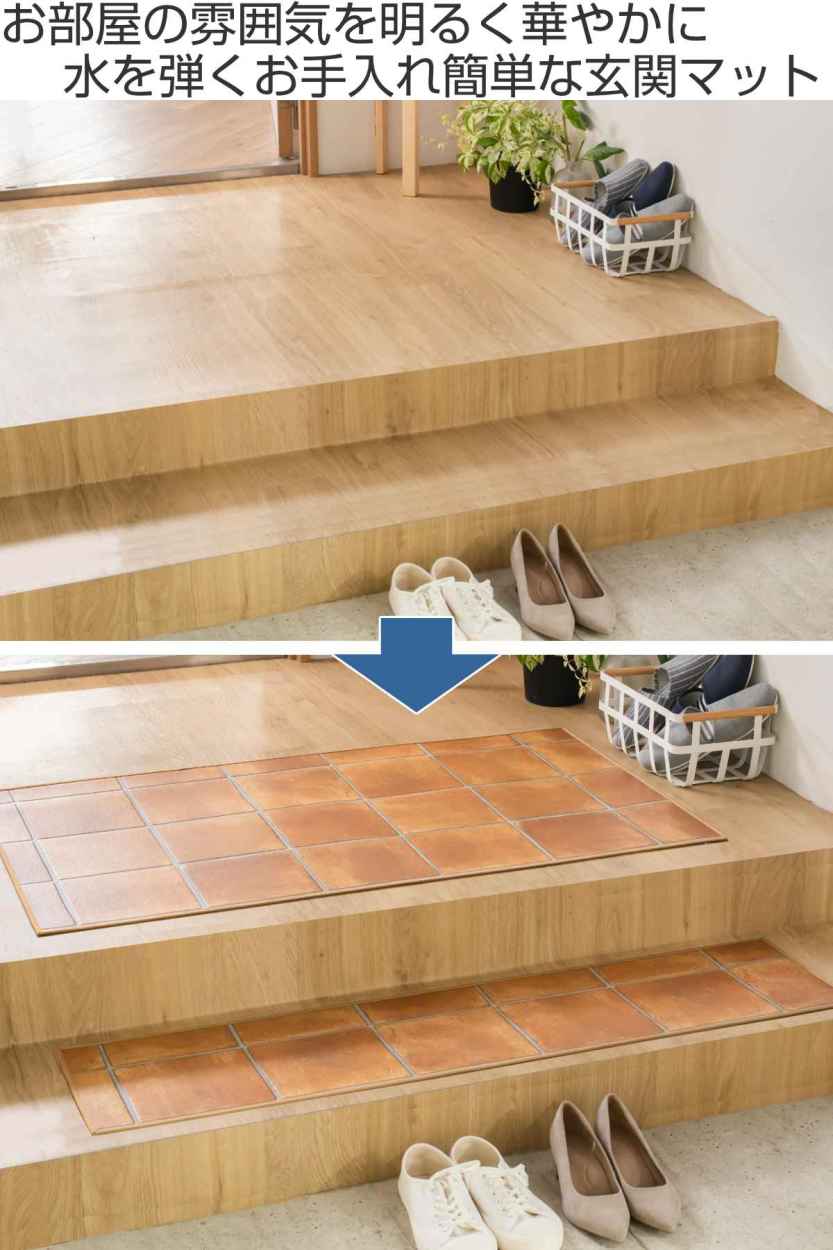 表面に防水、撥水効果のある塩化ビニル素材を使用しています。雨の日や濡れた足でもマットに染み込まずに水を弾いてくれます。サッと拭き取るだけなのでお手入れも簡単。きれいな状態を長く保ち、快適な空間を創ります。