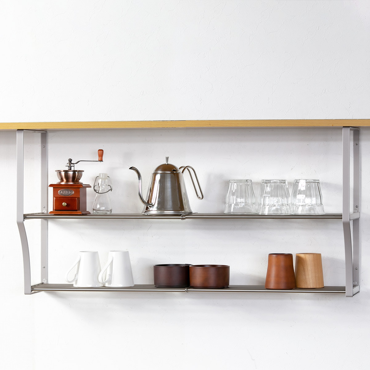 壁に設置することも可能吊戸棚下だけでなく、壁に設置することもできます。キッチンボード上に取り付けるだけで収納スペースを簡単に増やすことができます。また、シューズクロークや土間収納など、汚れが気になる部分の収納棚としてもおすすめです。