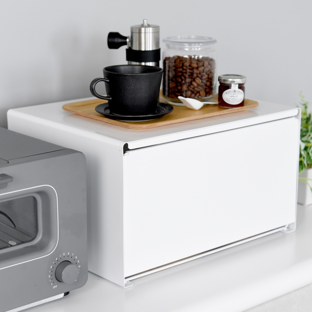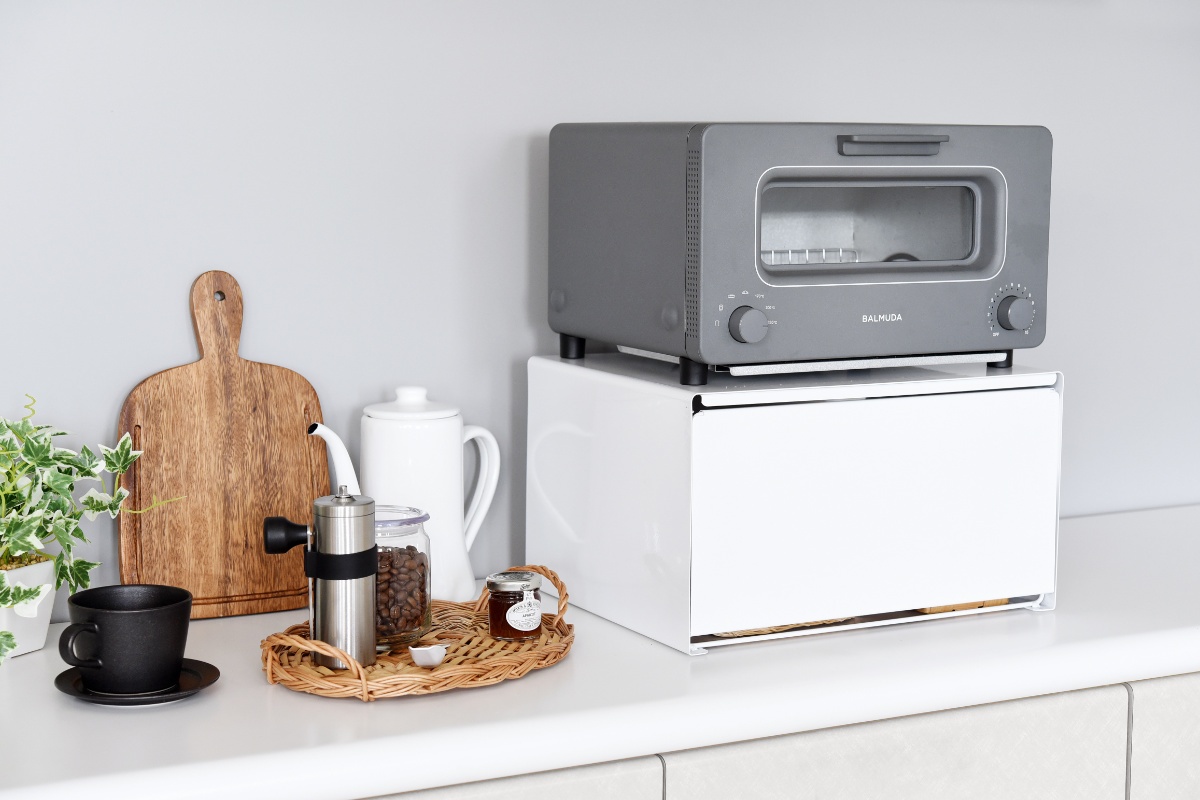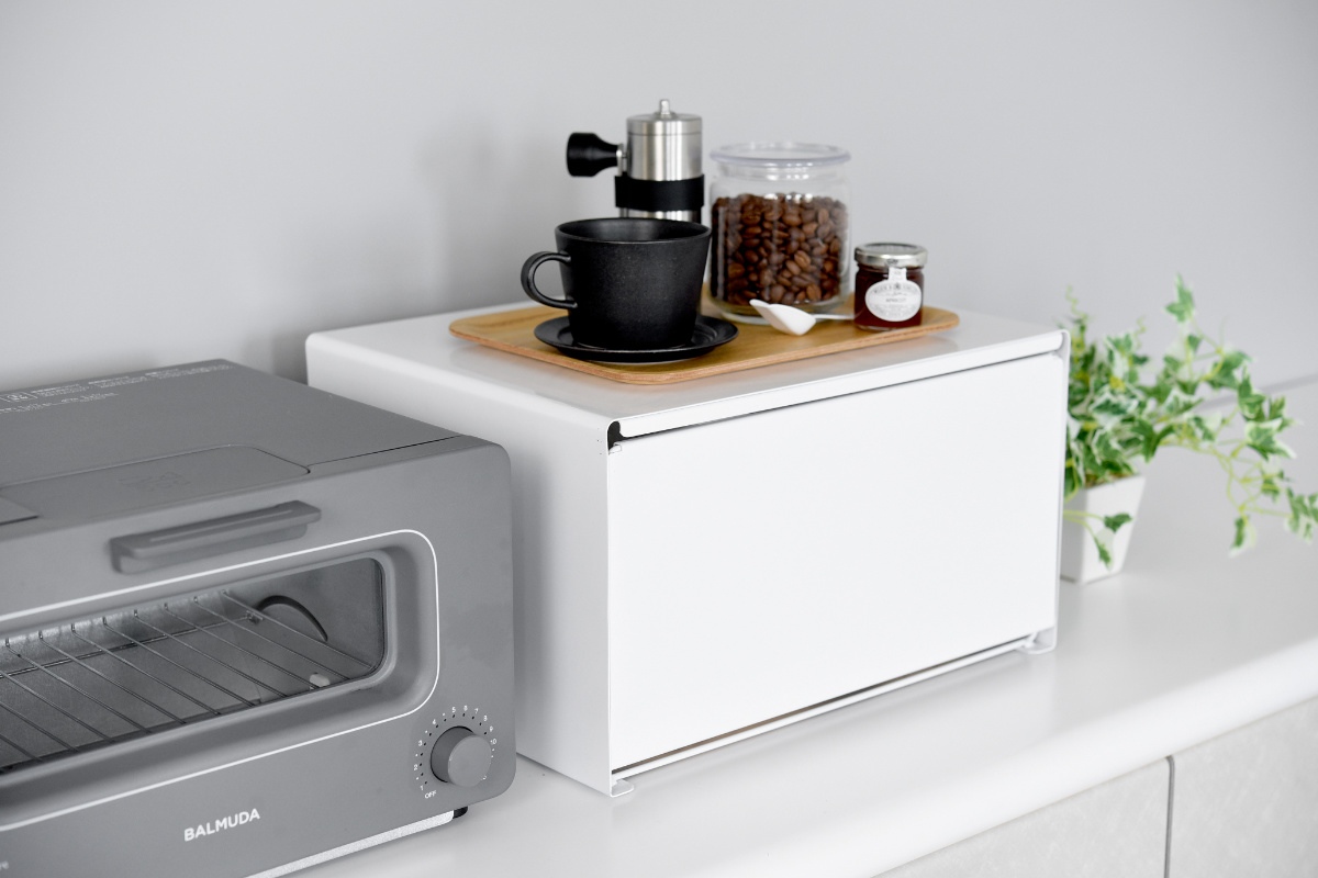広い天板にはトースターやコーヒーミル、電気ケトルなどを設置して使用することができます。天板スペースにトースターを設置して、ケースにパンや調味料を入れておけば、朝食準備もスムーズで時短になります。限られたカウンターのスペースを無駄にせず収納量を増やしてスッキリ整頓できます。
