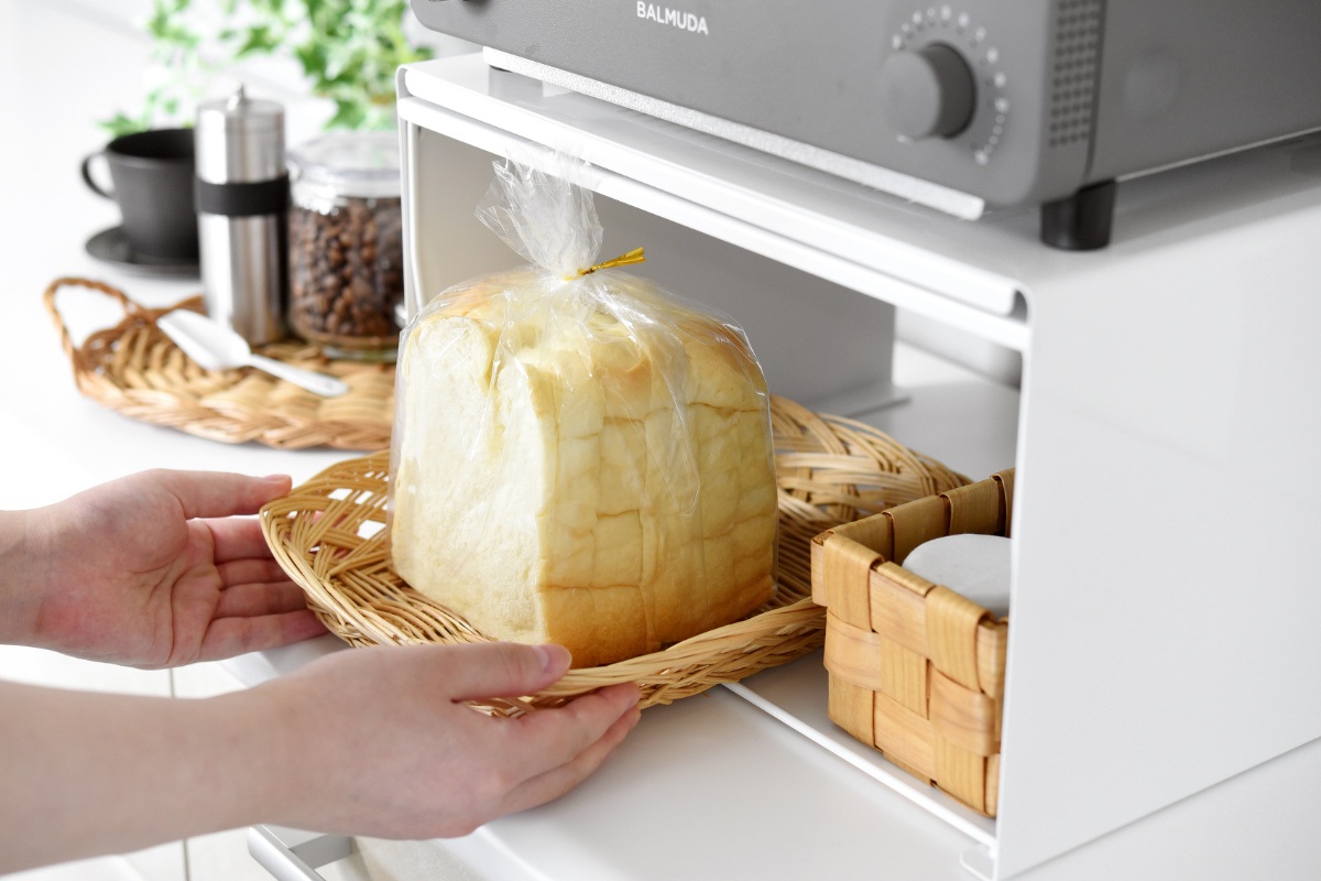 トースター周りの散らかりがちなパンや調味料などを隠してスッキリ収納することができます。