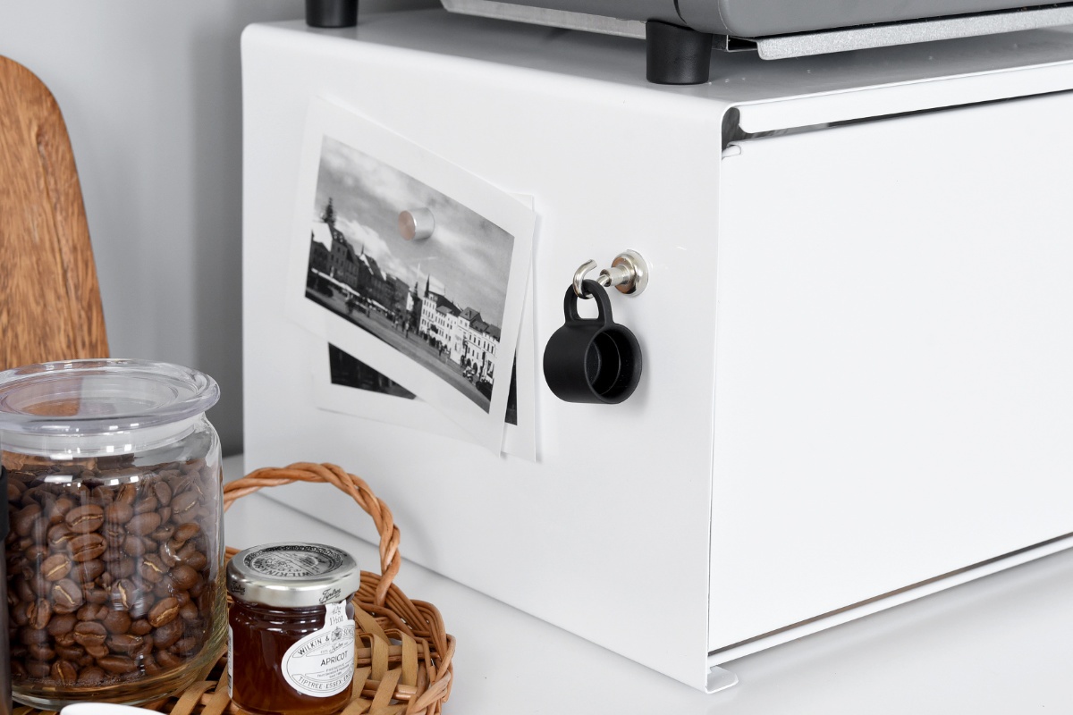 本体は汚れに強い粉体塗装を施したスチール製で、マグネットが付けられるので、メモやレシピを貼ることができます。また、マグネットフックを使えばちょっとした収納もプラスできます。