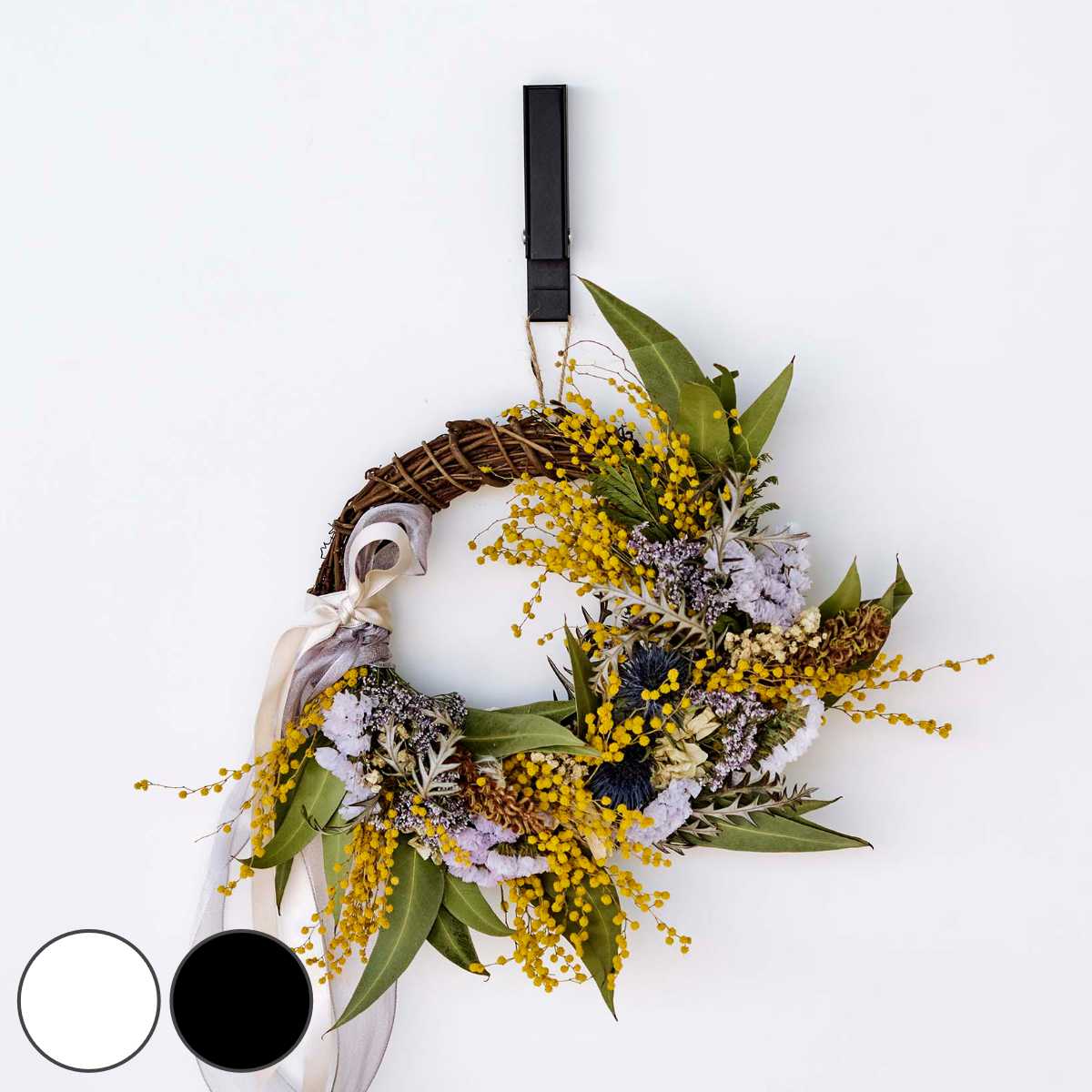 | 便利なマグネット仕様 背面はマグネット仕様なので、金属製の玄関扉などであれば付け直しや位置の調整も簡単に行っていただけます。 | 壁面への取り付けも可能 付属の石こうボード用プッシュピンで壁面への取り付けも可能です。用途に合わせてお好みの設置方法をお選びいただけます。 |