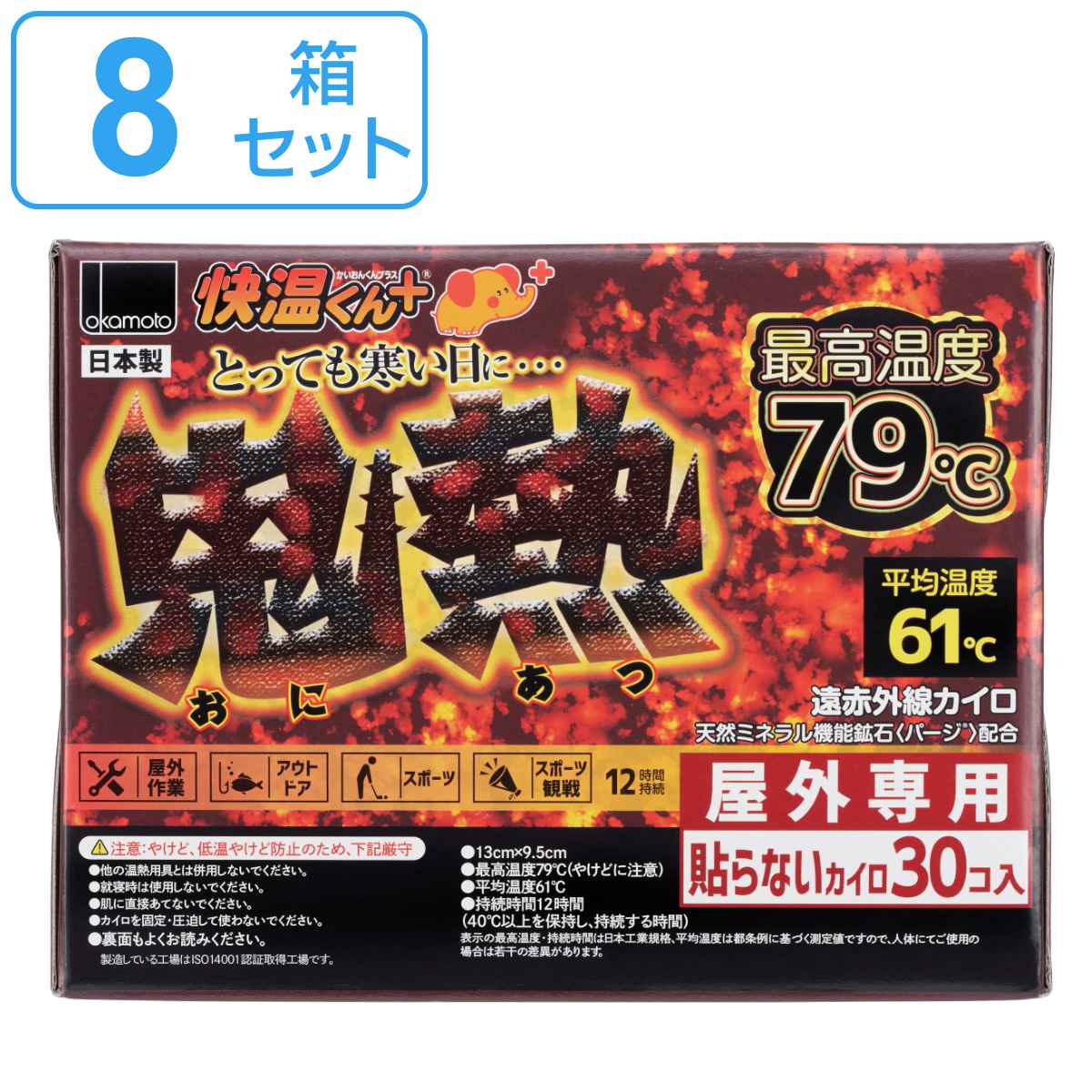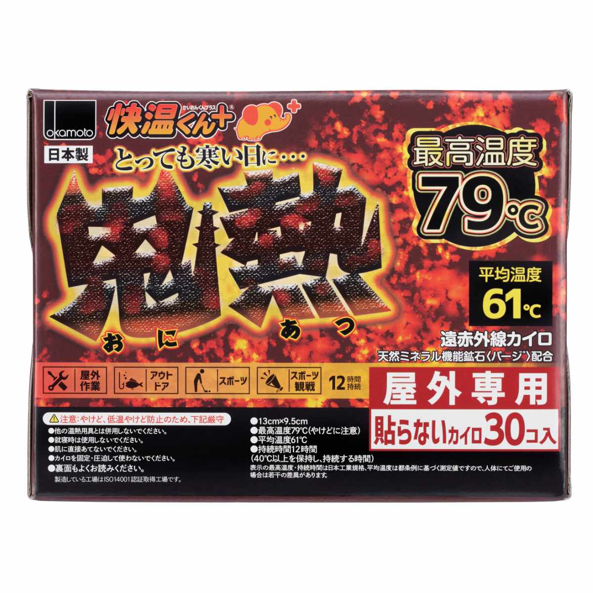 とっても寒い日に最適な「貼らないタイプ」のカイロとっても寒い日に最適な「貼らないタイプ」のカイロ30枚入りです。天然ミネラル機能鉱石パージ配合で、温かさがじわっと拡がり、身体を温めることができます。スポーツ観戦、アウトドア、屋外作業、イベントなど、とても寒い日におすすめです。屋外専用で、持続時間は40度以上を12時間を保ち、最高温度79度、平均温度61度です。