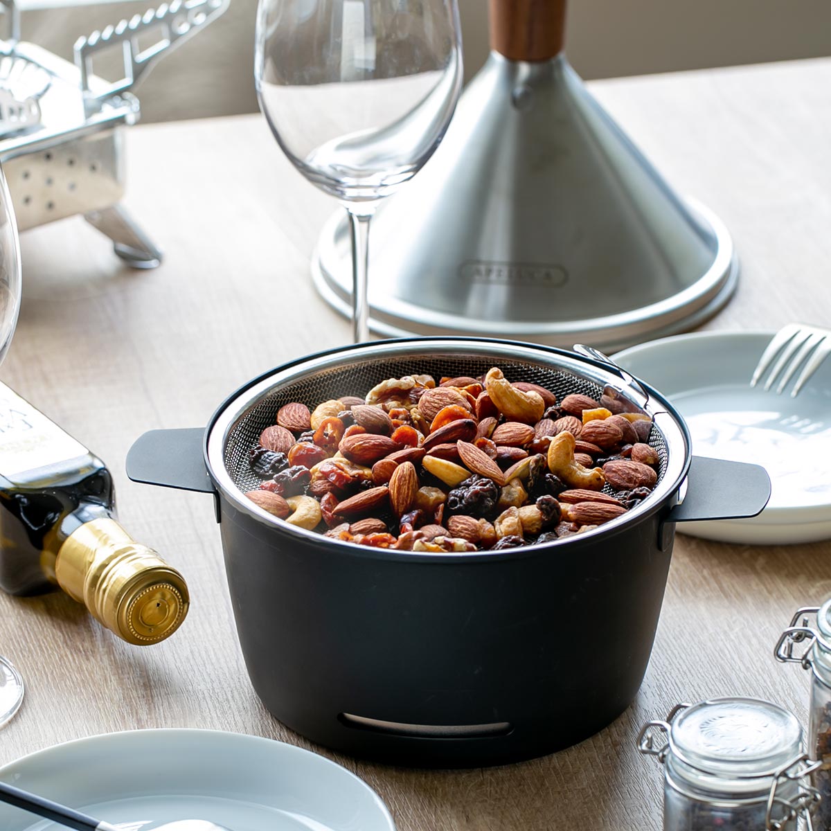 テーブルの上で簡単・手軽に燻製をカジュアルなもてなしのテーブルに置きたい小さな燻製器です。小さな食材から気軽にトライできるのが魅力です。出来上がるまでの間、蓋の穴からフワリと流れる煙を見ながら、香りだけでなくのんびりしたムードまで楽しめます。