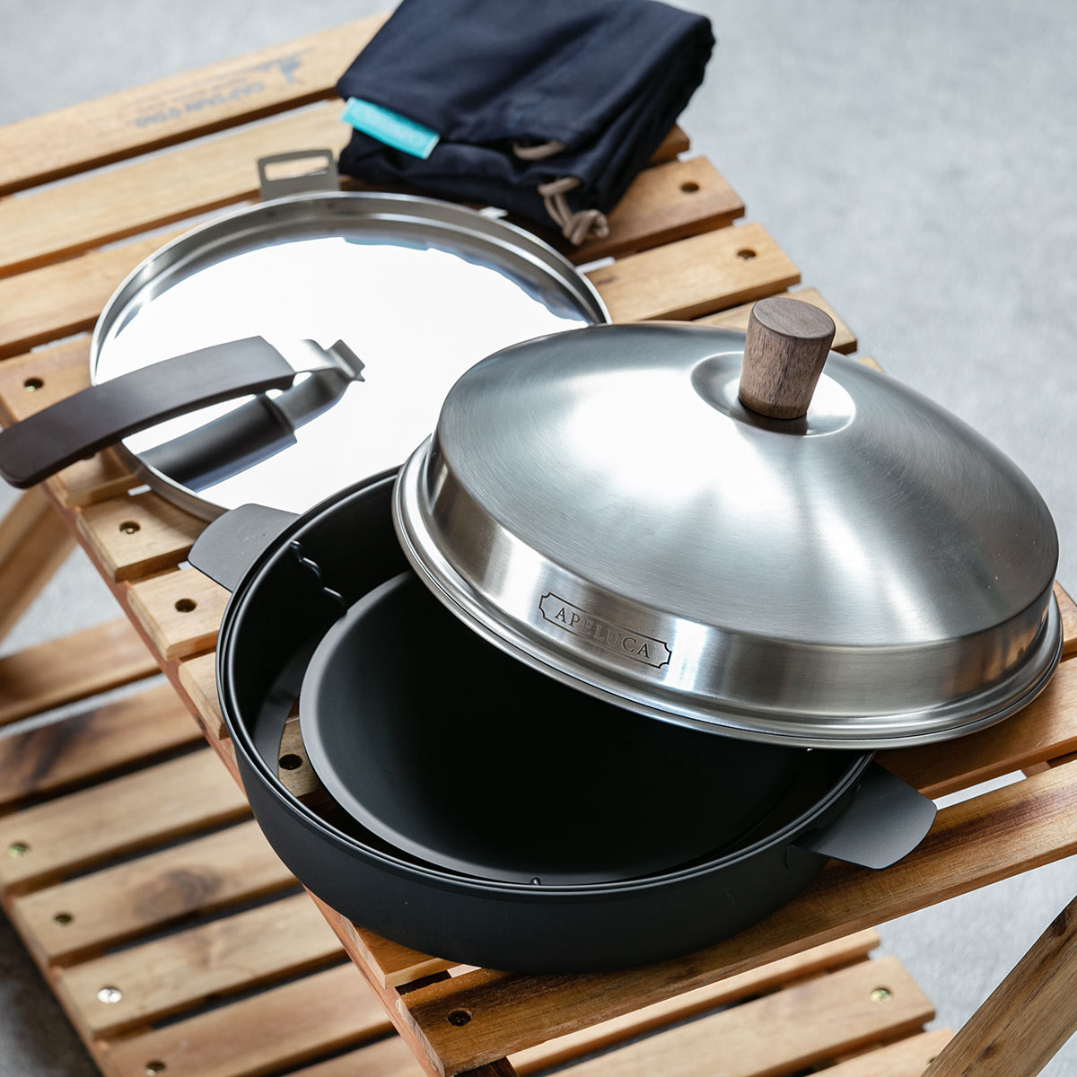 | 材質 | 本体:鋼板(シリコン樹脂塗装) 蓋、ピザプレート:ステンレス鋼(クロム18%、ニッケル8%) 中蓋:鋼板(フッ素樹脂塗装) つまみ:ウォールナット(天然オイル塗り) ハンドル:フェノール樹脂、ステンレス鋼(クロム18%) |
