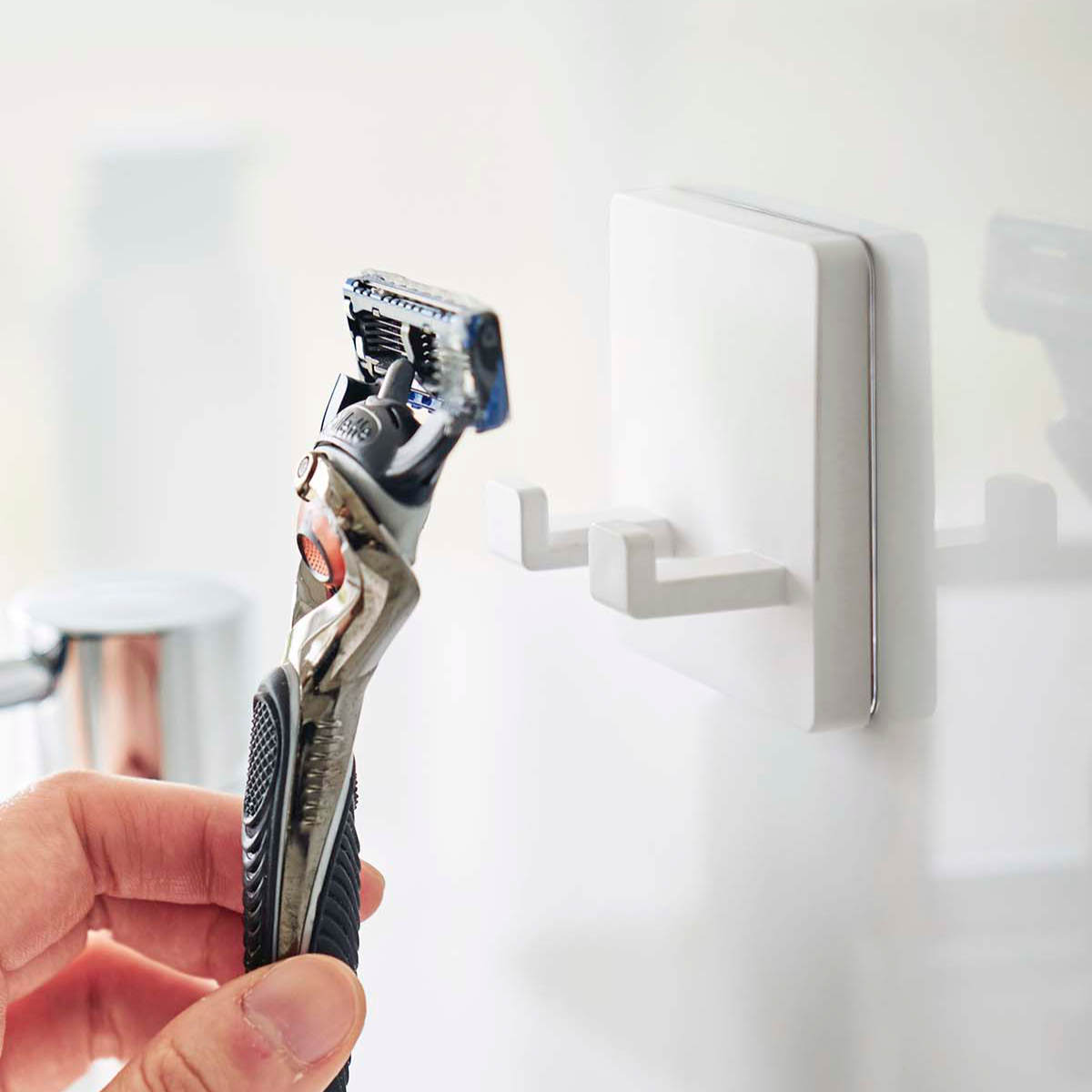 バスルームや洗面台の光沢のある壁面にフィルムフックで取り付ける、シェーバー用ホルダーです。浮かせて収納できるので、水洗いした後も水切れがよく、シェーバーがぬめらず衛生的です。