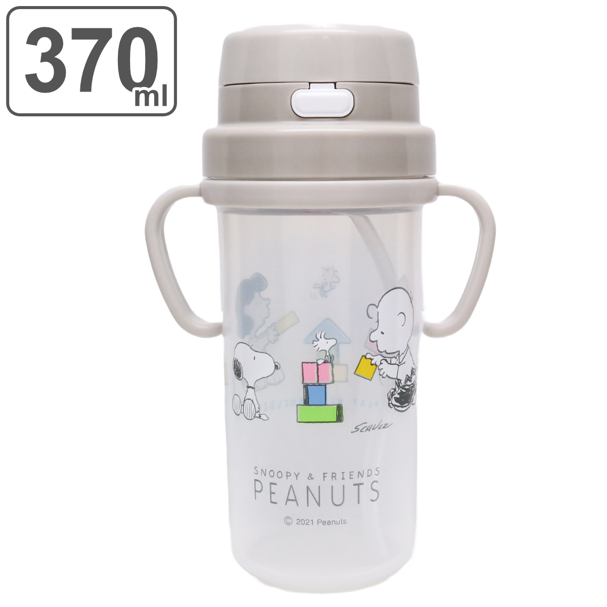 ショルダーベルトが付けられるリング付きストローボトル●小さなお子様のストローの練習にぴったりのスヌーピーのストローボトルです。