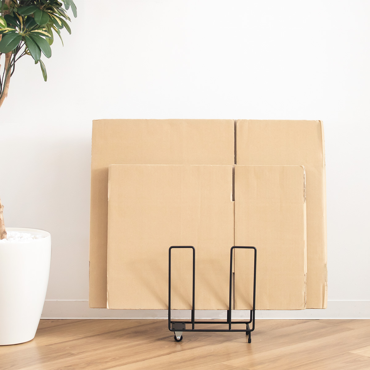 かさばるダンボールをスッキリと収納できるダンボールストッカーです。大きさの違うダンボールでもバラバラにならず収納することができるので、見た目もスッキリと収まります。