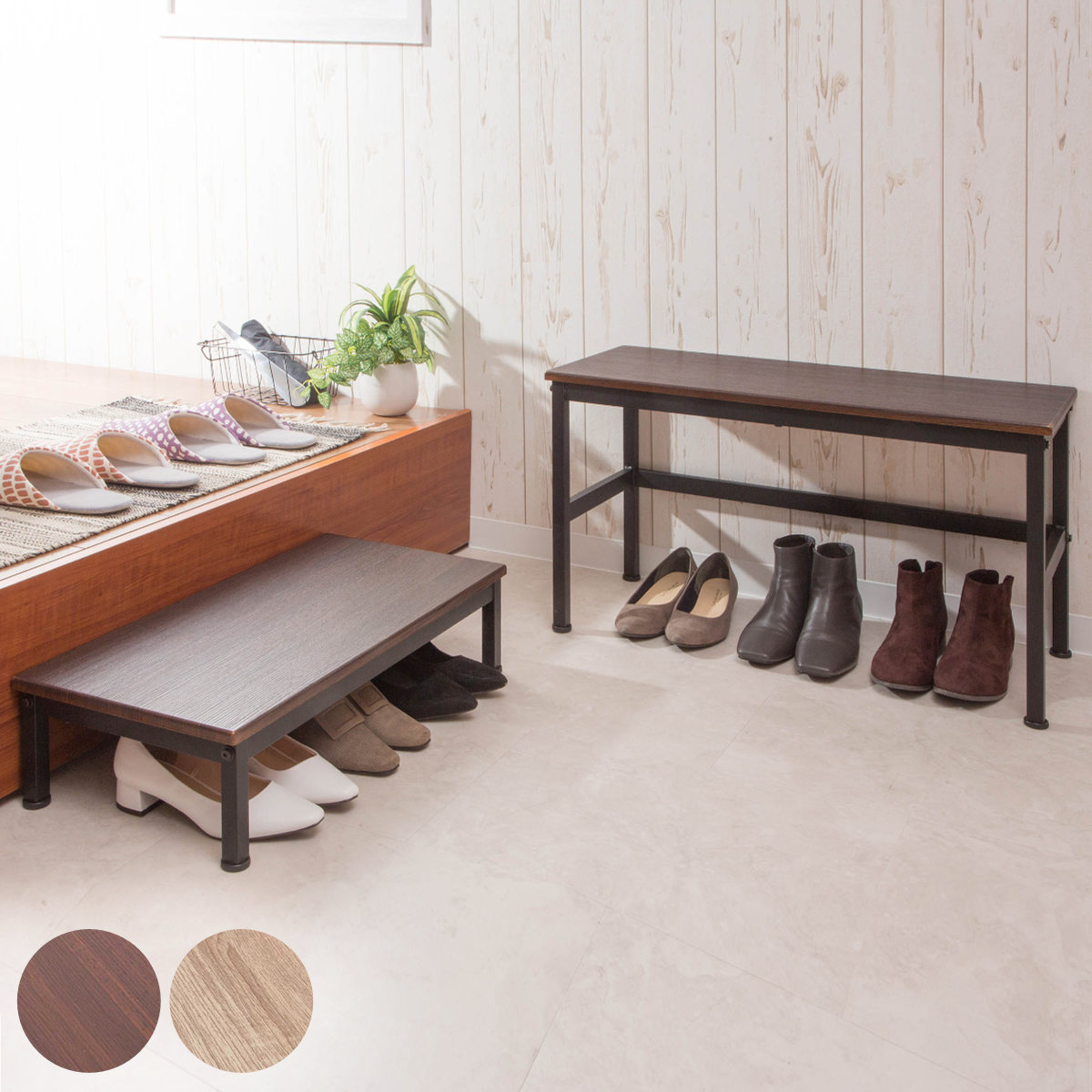 ベンチと踏み台としてはもちろん、一時的な荷物置きやベンチ+靴収納として、横並びに置いて大人と子供用のベンチとしても最適です。シーンに合わせて自由自在にレイアウトしていただけます。