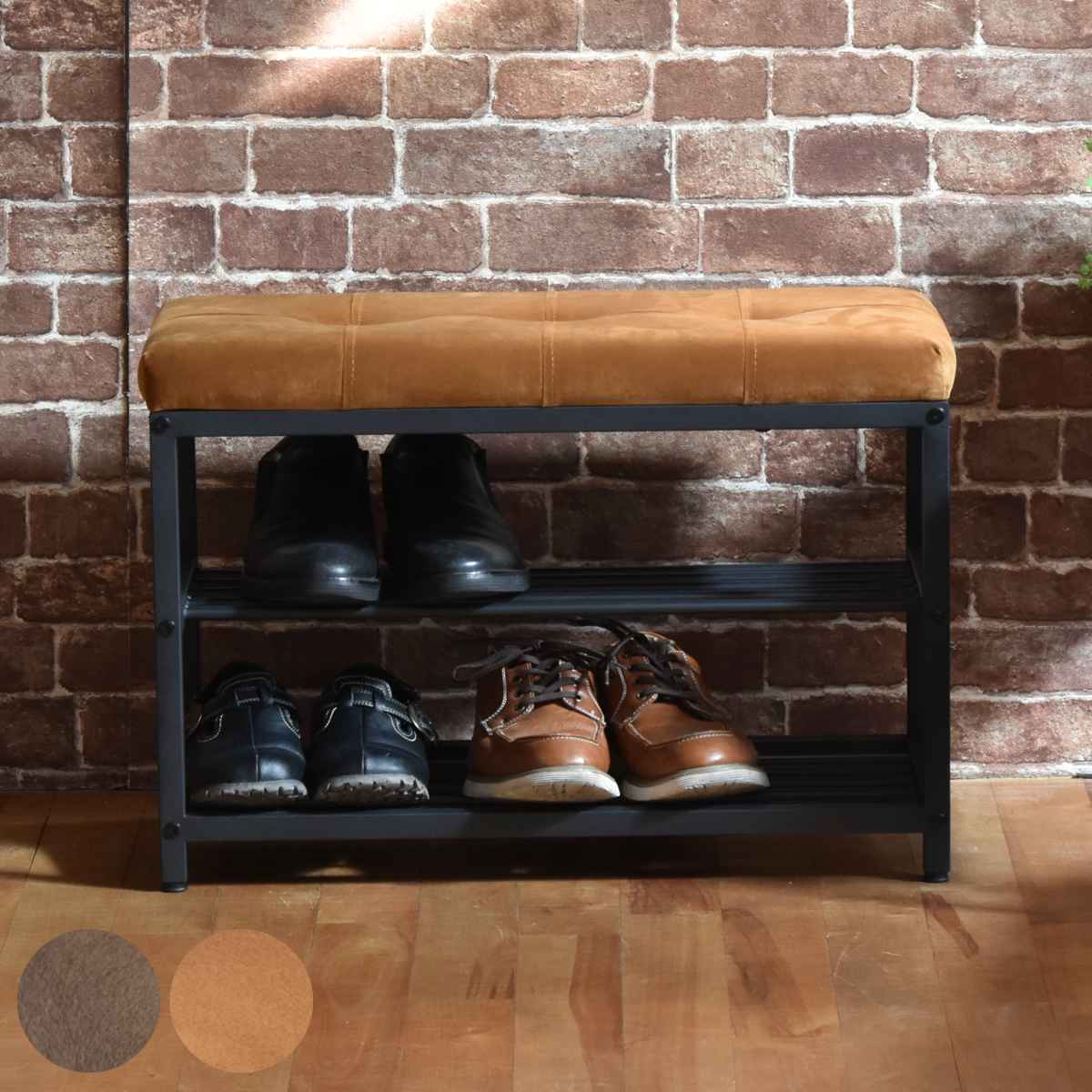 座面下に2段の収納スペースを備えています。女性用なら6足、男性用なら4足収納することができます。靴だけでなく、スリッパやシューケア用品、室内に持ち込みづらいお子様の遊び道具など幅広い収納にお使いいただけます。