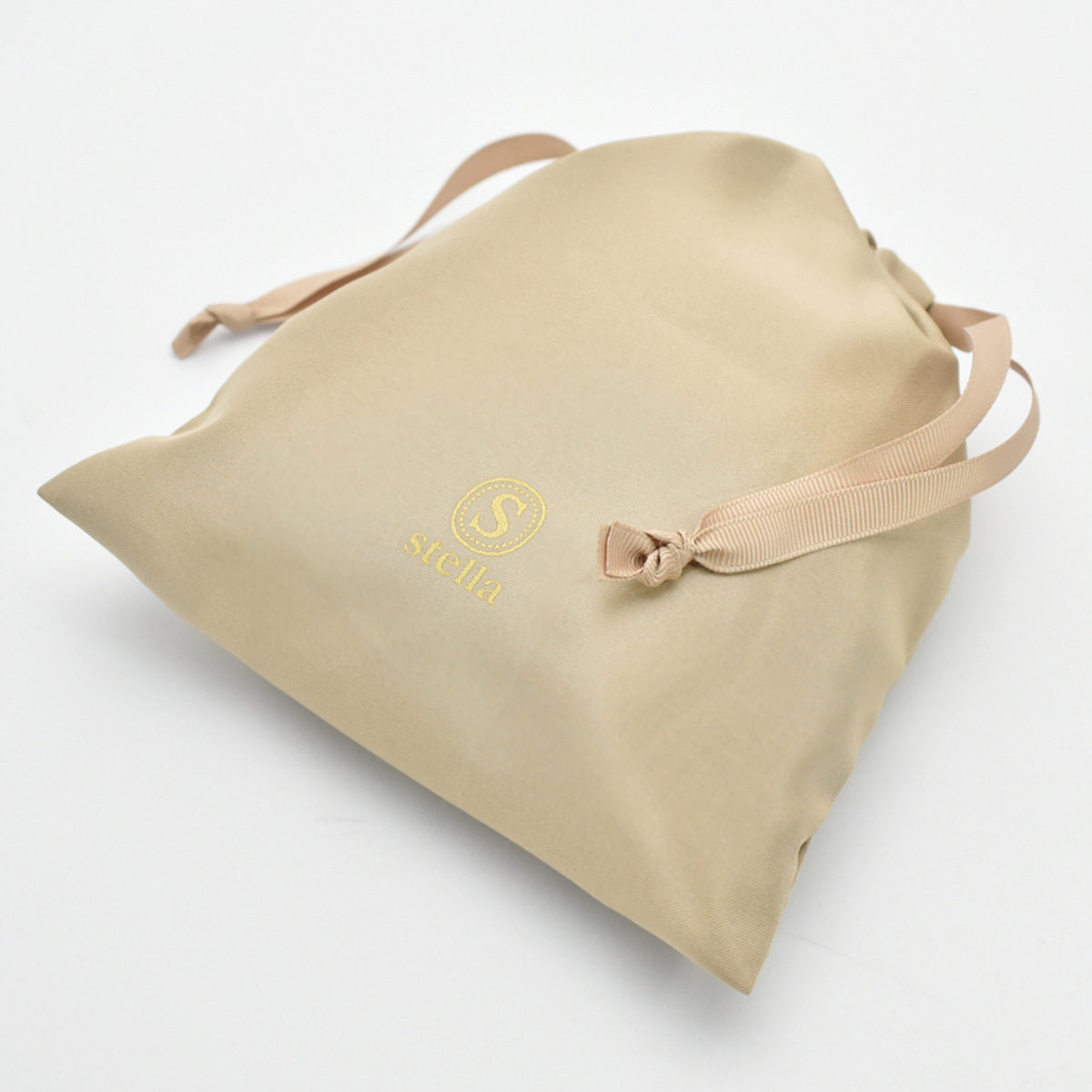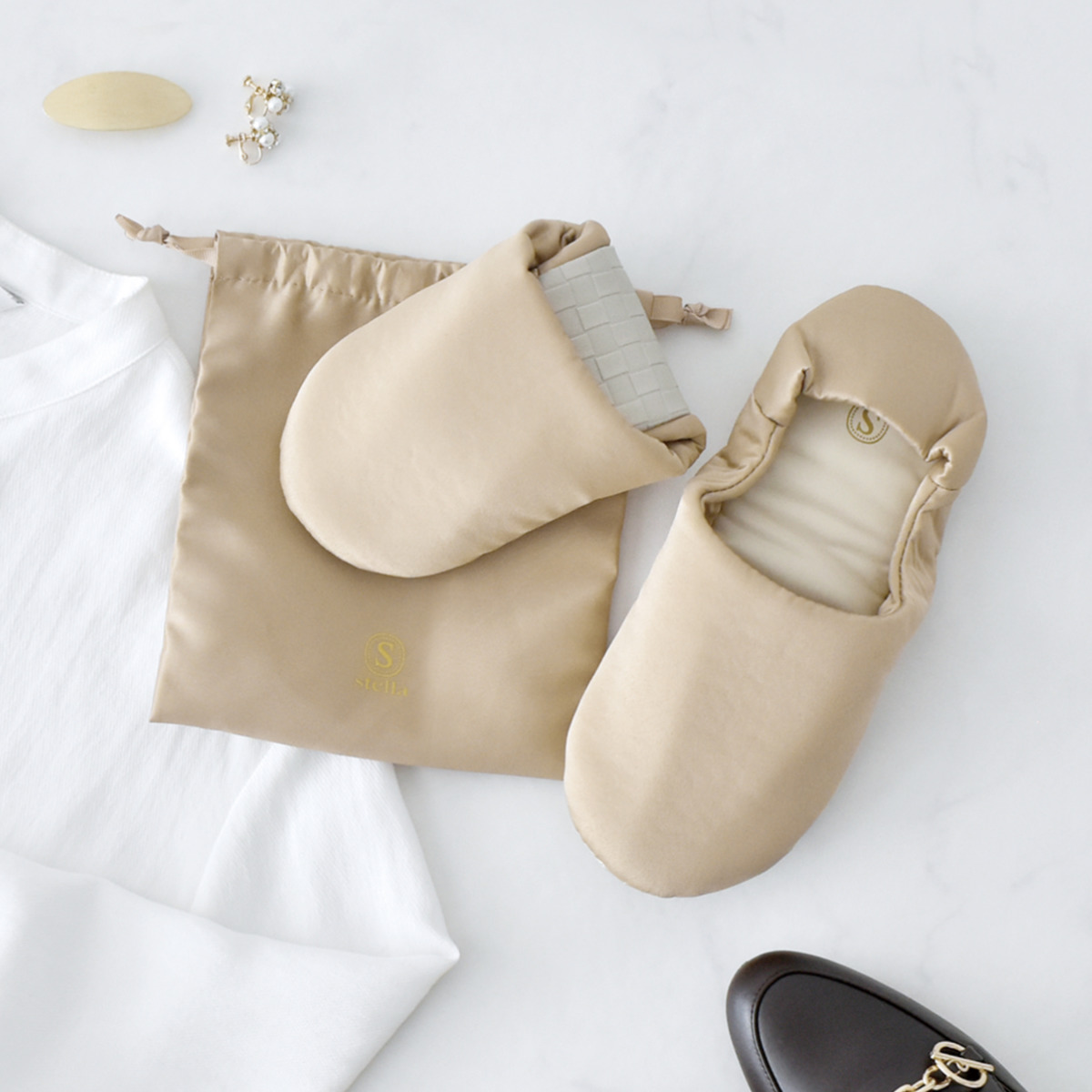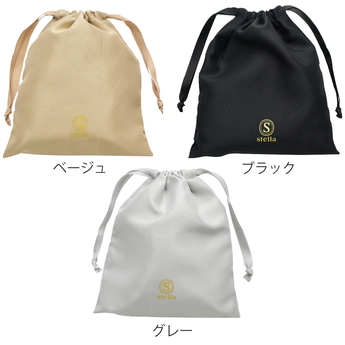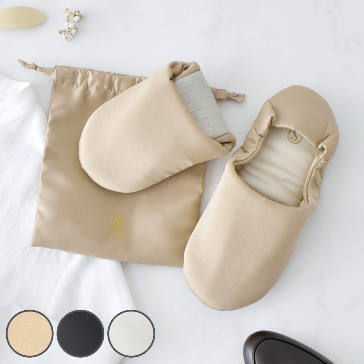 持ち運びに便利な巾着付き折りたたんでコンパクトに収納することができます。持ち歩きしやすいように巾着ポーチが付いています。スリッパと同じサテン生地を使用し、ゴールドロゴとグログランリボンでワンランク上の仕上がりです。