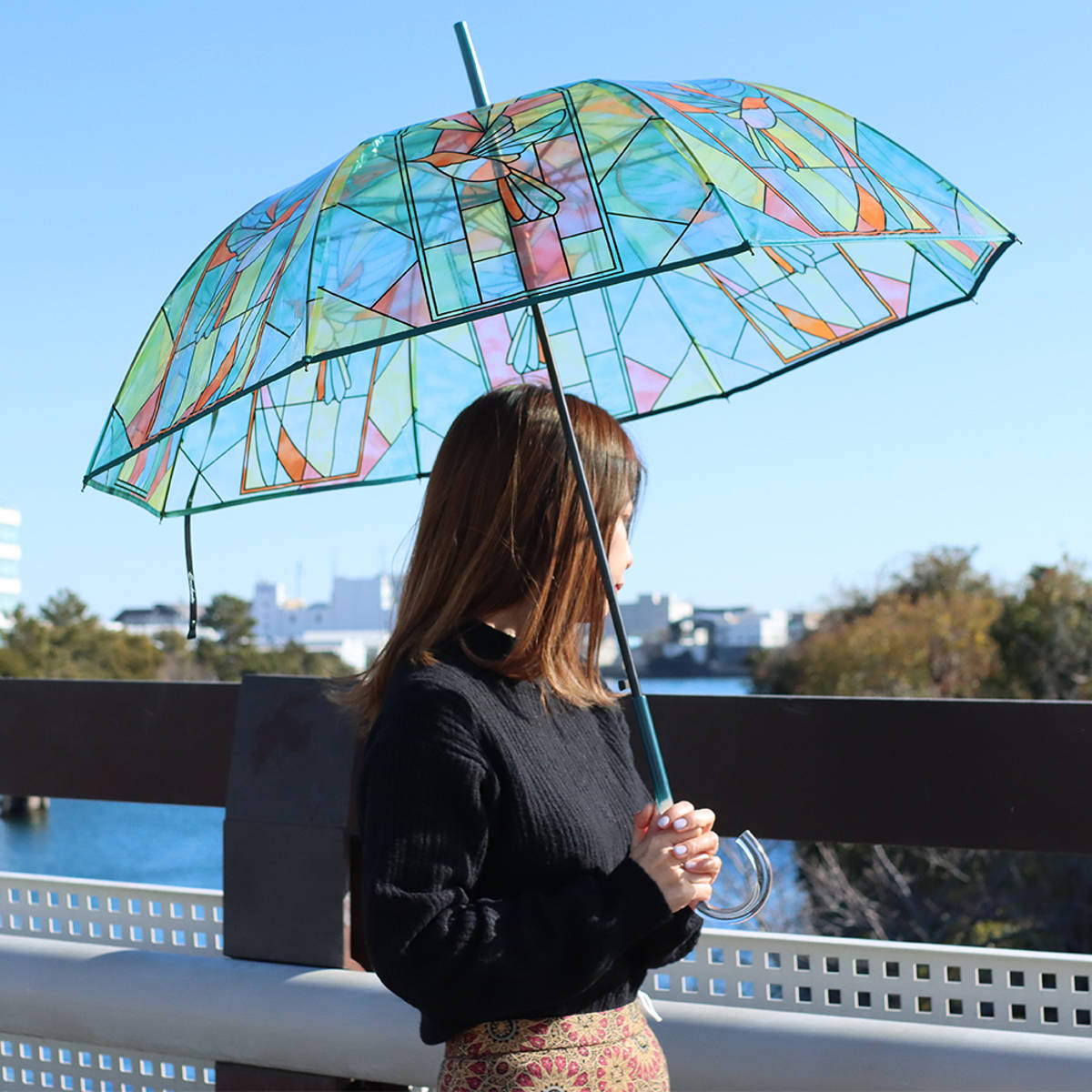 ●ポリエチレン傘の特徴である透明素材を生かし、ステンドグラスに見立てたデザインです。