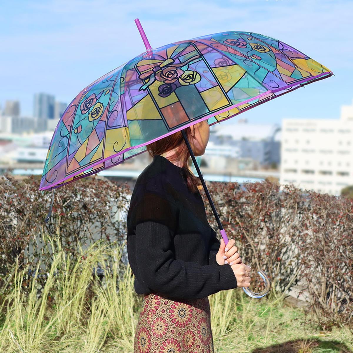 ●ポリエチレン傘の特徴である透明素材を生かし、ステンドグラスに見立てたデザインです。