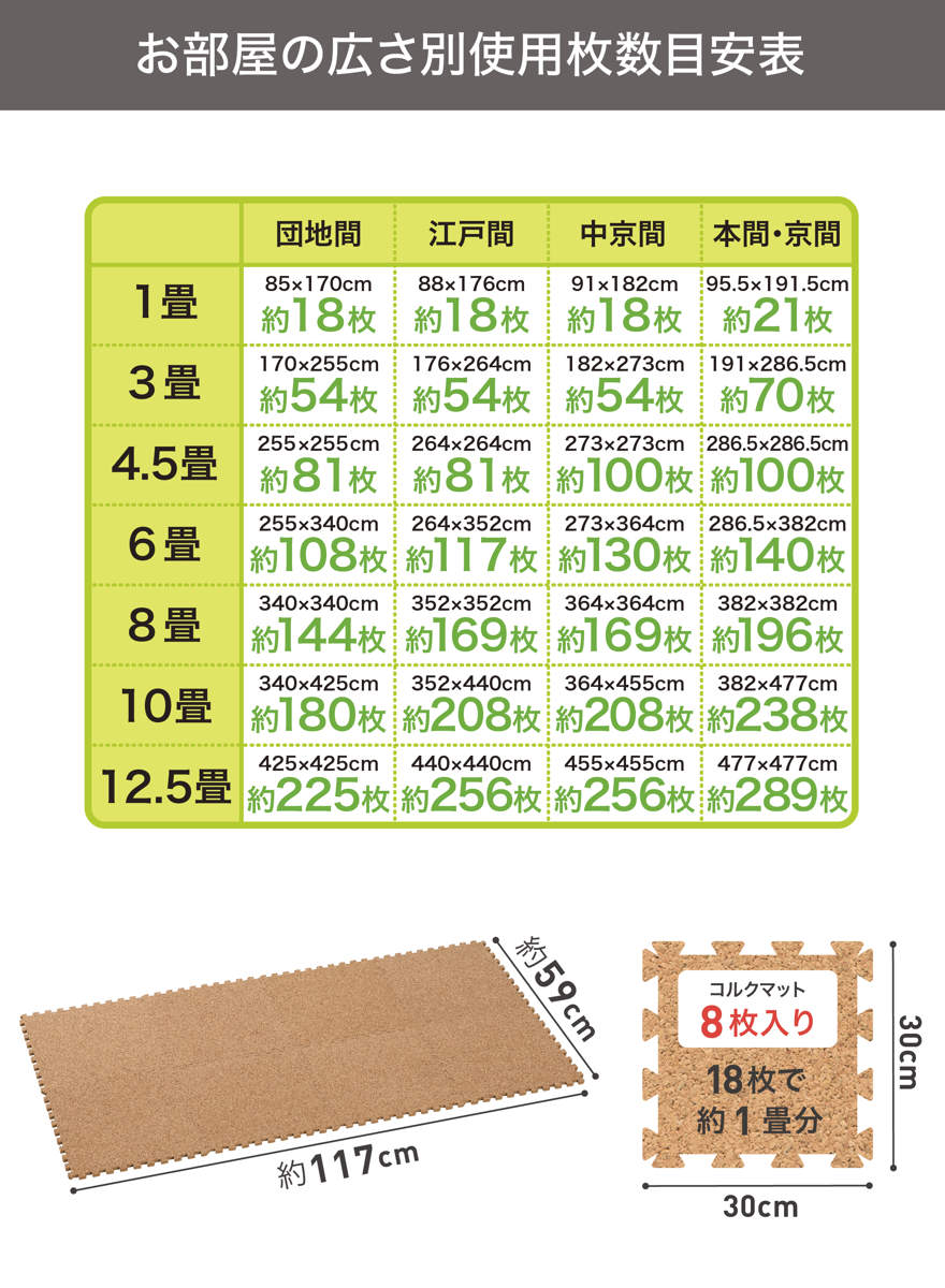 表面は天然コルクを使用しているので、夏はサラッと爽やかに、冬は保温効果もあるので暖かく快適な踏み心地が味わえます。ジョイント部のつなぎ目が目立ちにくくお部屋に馴染むので、こだわりのインテリアにも最適です。