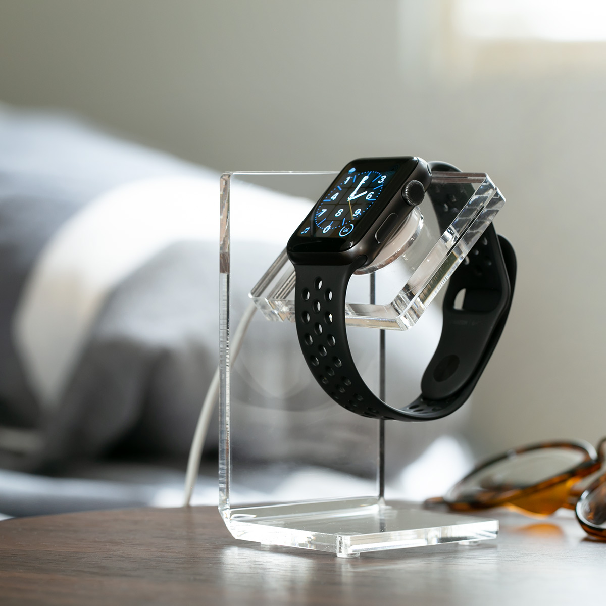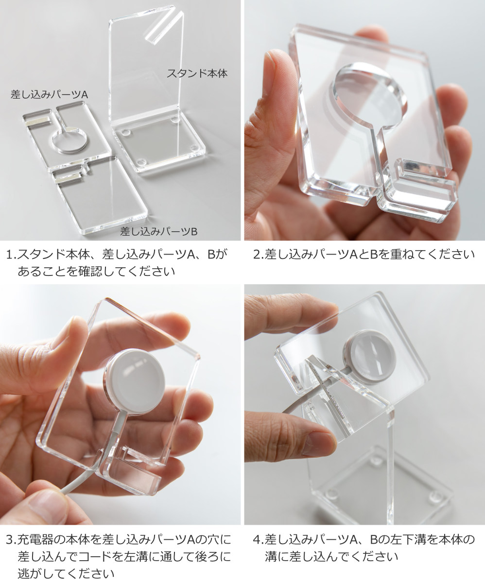 充電しながら魅力的に飾る文字盤が見やすい角度になるようにデザインされたアップルウォッチスタンドは、置き場所を選ばず充電しながら美しく飾ることができます。アクリル素材なのでまるで空中に浮いているかのようにアップルウォッチを置いておけます。