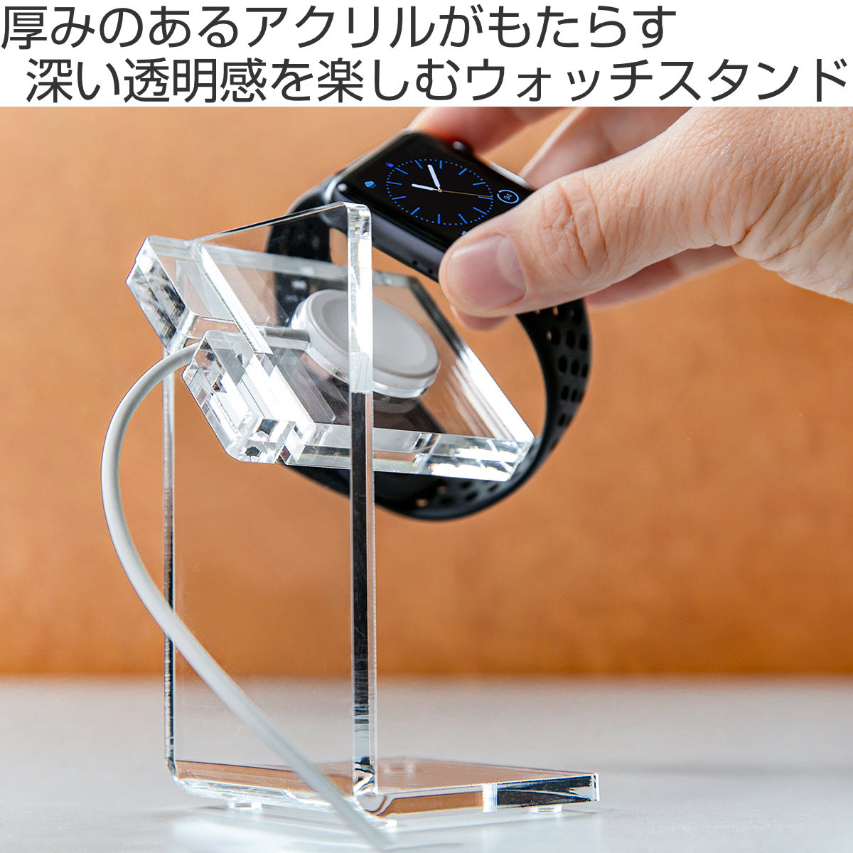 ゆとりを生む透過性アクリルの透明感が美しいアップルウォッチスタンドです。アクリルのクリアな見た目は、お部屋にスッキリとした清潔感と広がりのある開放感を与えてくれます。日の当たる場所であれば、時間によって表情を変えて楽しませてくれるのも魅力の1つです。