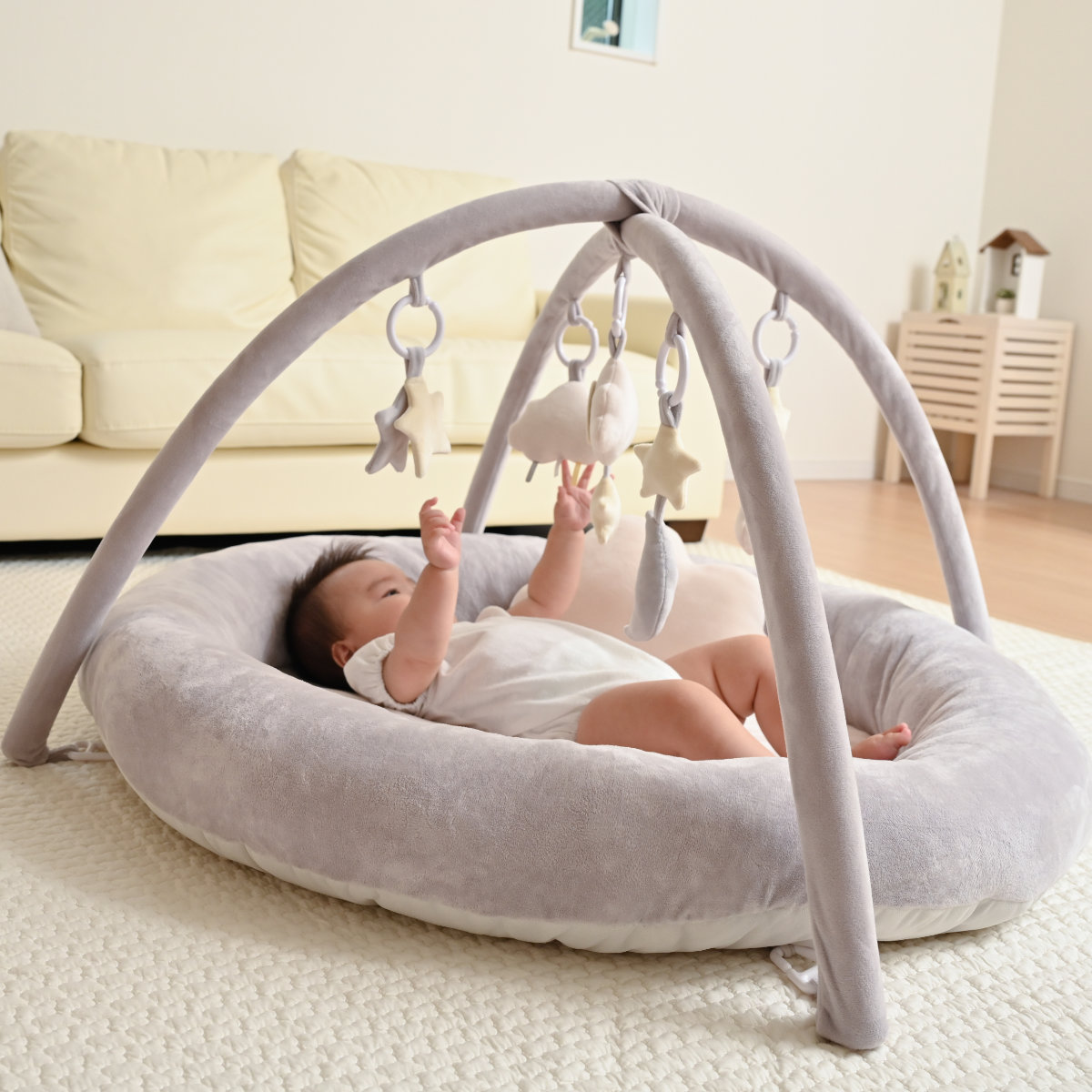 おそらの雲の上がモチーフのプレイジムマットふわふわな柔らかい雲をモチーフにしたプレイジムマットです。トイバーはママのおなかの中を連想させる丸みのあるアーチ型で、どこか安心感があり、お子さまが心地良く遊べる空間になります。流行に左右されずどんなシーンにも溶け込んでくれるペールトーンのカラーが、優しくお部屋を彩ります。出産祝いのプレゼントにも最適です。