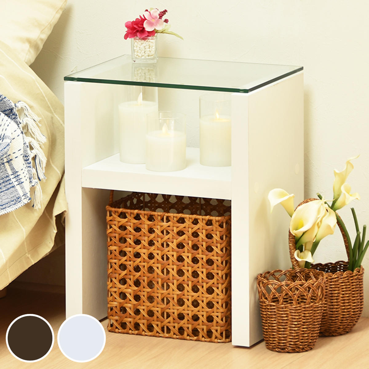 | 材質 | 天板:8mm強化ガラス 棚板・側板:中質繊維板にPVC貼り(塩化ビニルシート) |