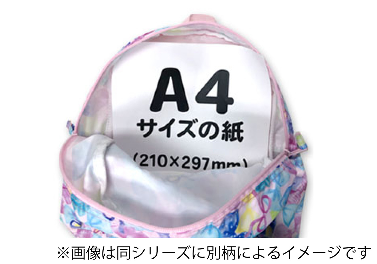 A4サイズよりも一回り小さめのサイズ感A4サイズよりも一回り小さめのサイズ感です。保育園、幼稚園、遠足や普段のおでかけにと様々なシーンでお使いいただけます。