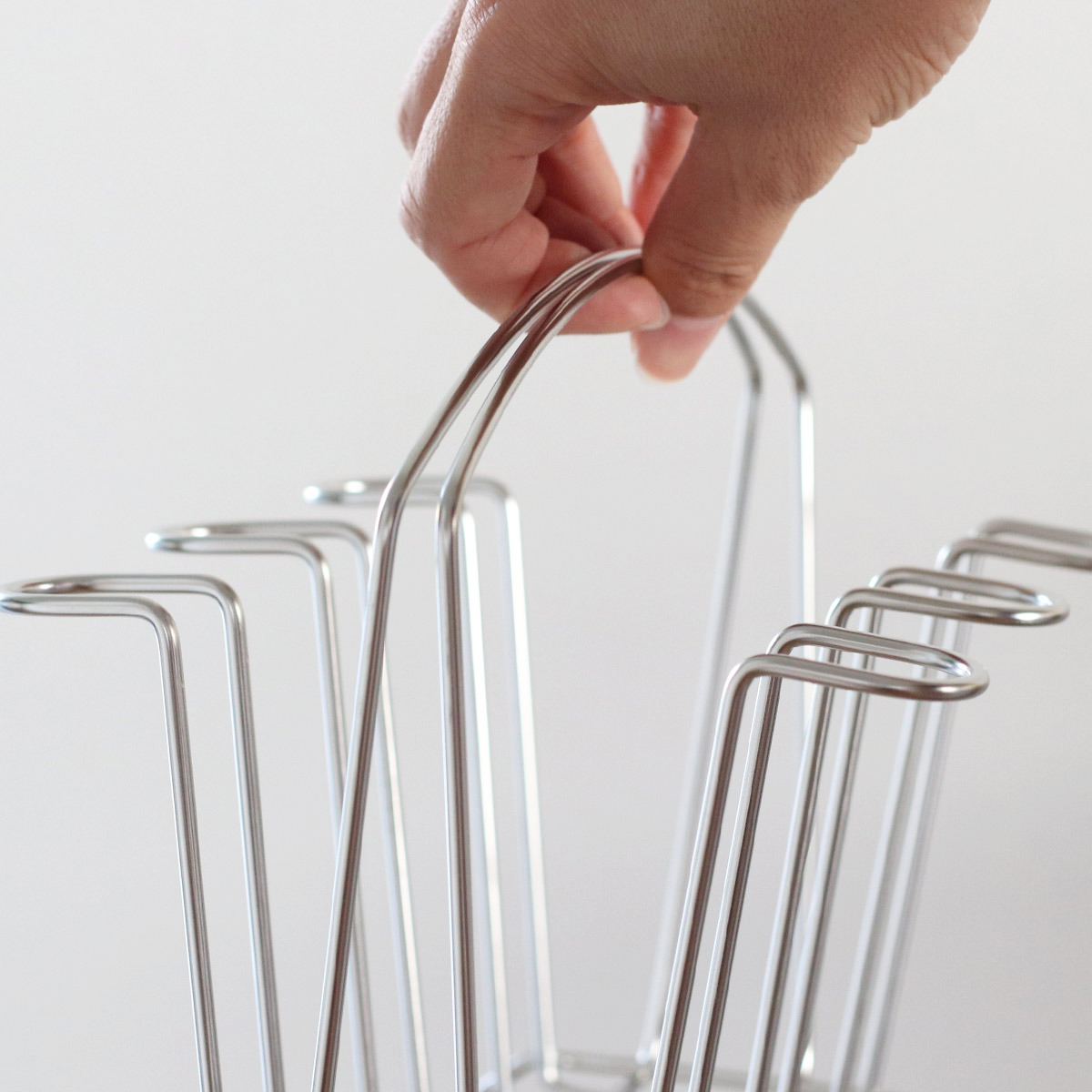 素材には高品質18-8ステンレスを使用。約4.0mmの線材の醸し出す高級感のある仕上がりです。グラスを見せる収納にしてカウンターやテーブルに置いてもスタイリッシュな印象に。様々なインテリアにも自然に馴染むスッキリとしたフォルムのグラスラックです。