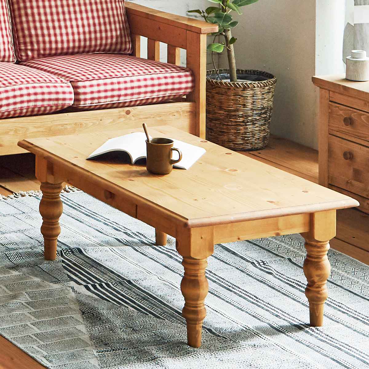 自然に囲まれているような、素朴さとぬくもり感のあるカントリースタイルのローテーブルです。天然木無垢材を使用しているので、使い込むほどに味わい深くなり、温かみのある空間を演出します。