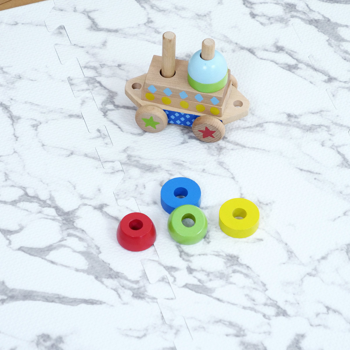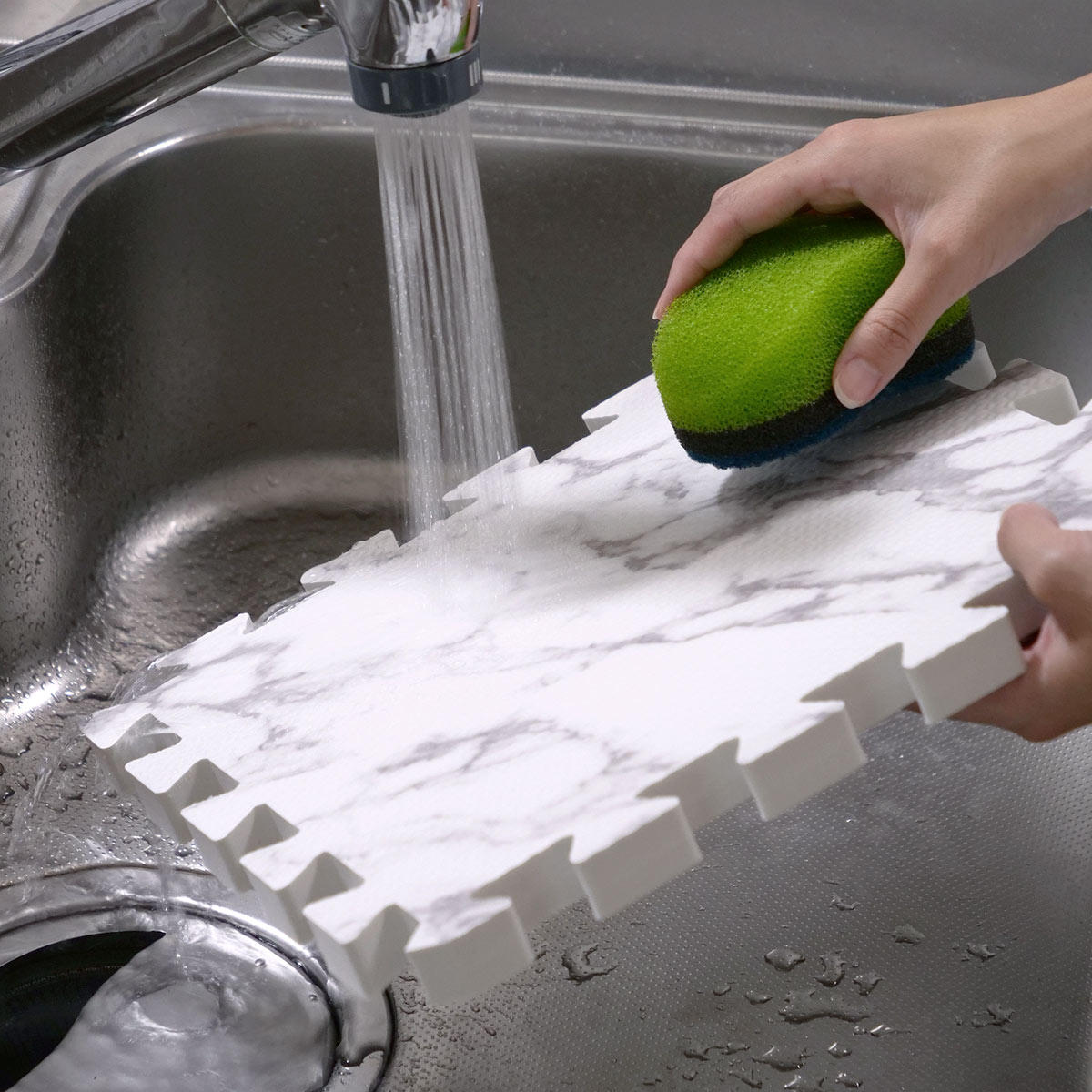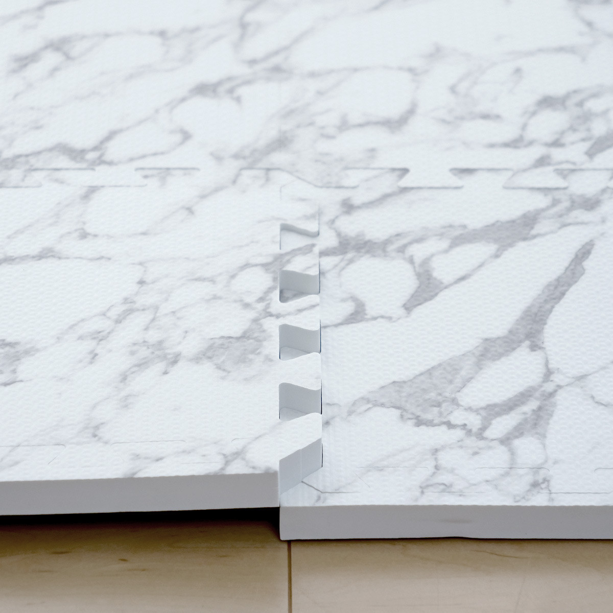 大理石柄フチ付きジョイントマット 6枚組お子様やペットのいるご家庭などにおすすめな、フチ付きジョイントマットです。 家具の脚などから床を守る弾力性、汚れても簡単に拭き取れる耐久性、ノンホルムアルデヒドや抗菌加工の安全性、床暖房対応などの機能性を兼ね備えています。