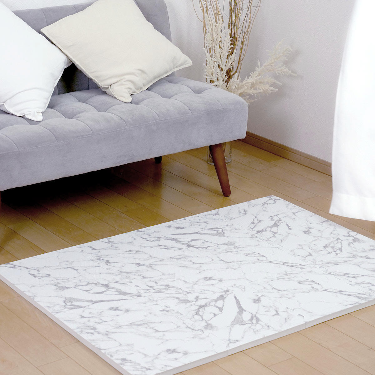 大理石柄フチ付きジョイントマット 36枚セットお子様やペットのいるご家庭などにおすすめな、フチ付きジョイントマットです。 家具の脚などから床を守る弾力性、汚れても簡単に拭き取れる耐久性、ノンホルムアルデヒドや抗菌加工の安全性、床暖房対応などの機能性を兼ね備えています。