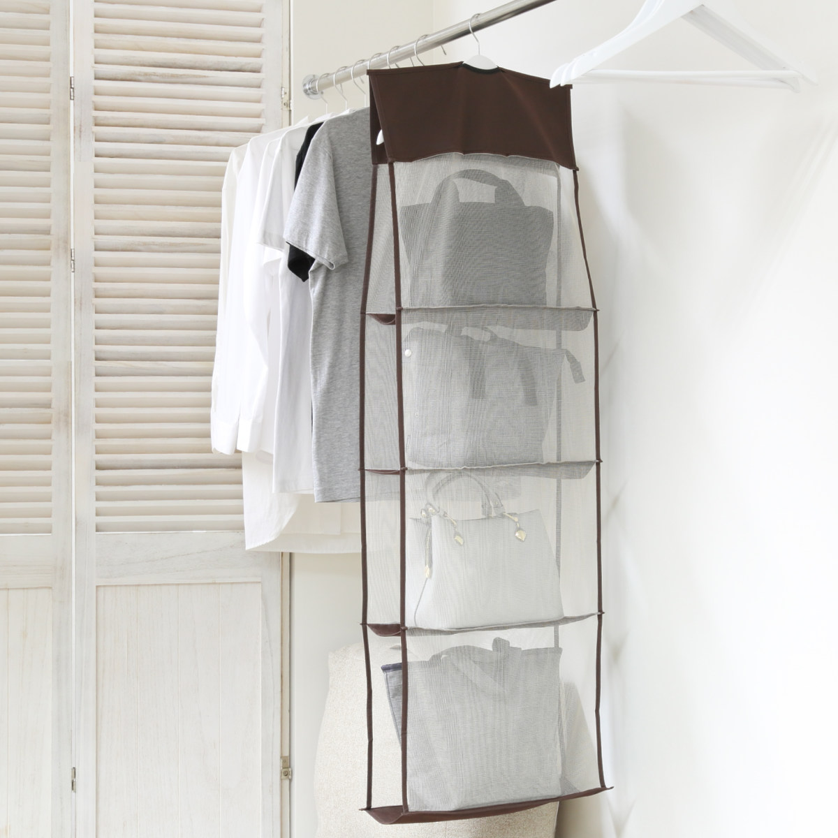 ●型崩れしやすいバッグをキレイに保管できる吊り下げ収納ラックです。