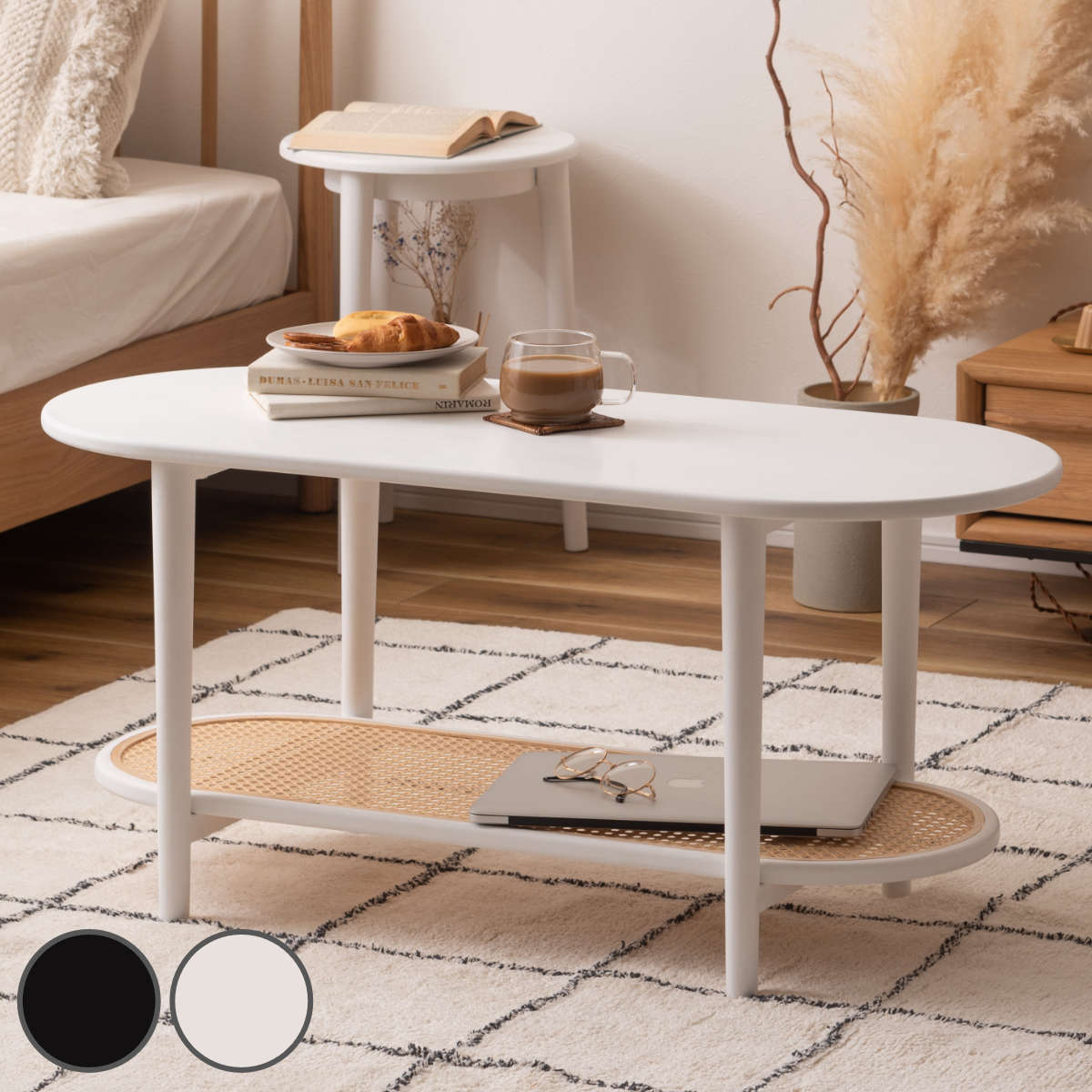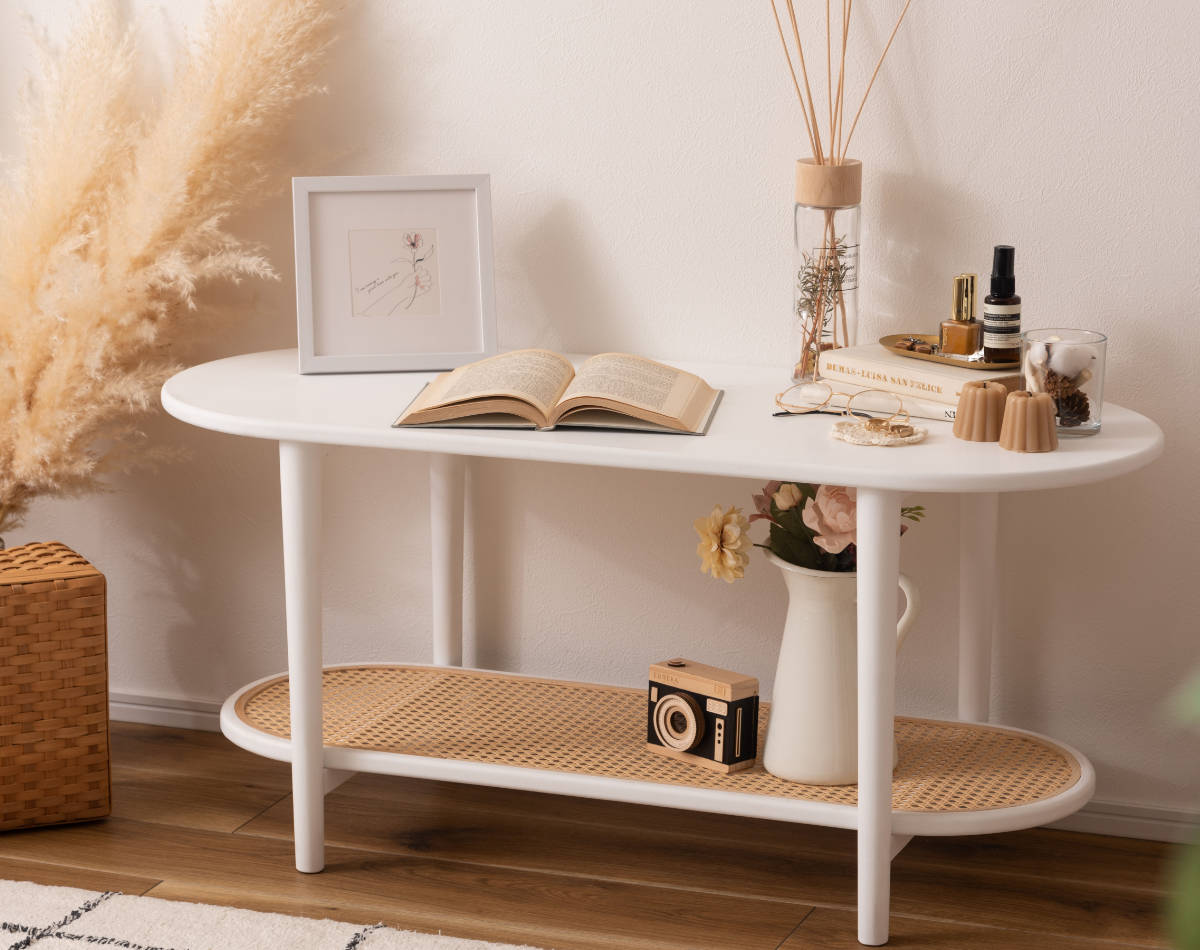 ラタン調の棚板が目を惹く、おしゃれなリビングテーブルです。ソファと組み合わせて使いやすい、やさしい雰囲気の楕円形で、ひとり暮らしのお部屋にも置きやすいサイズ感です。