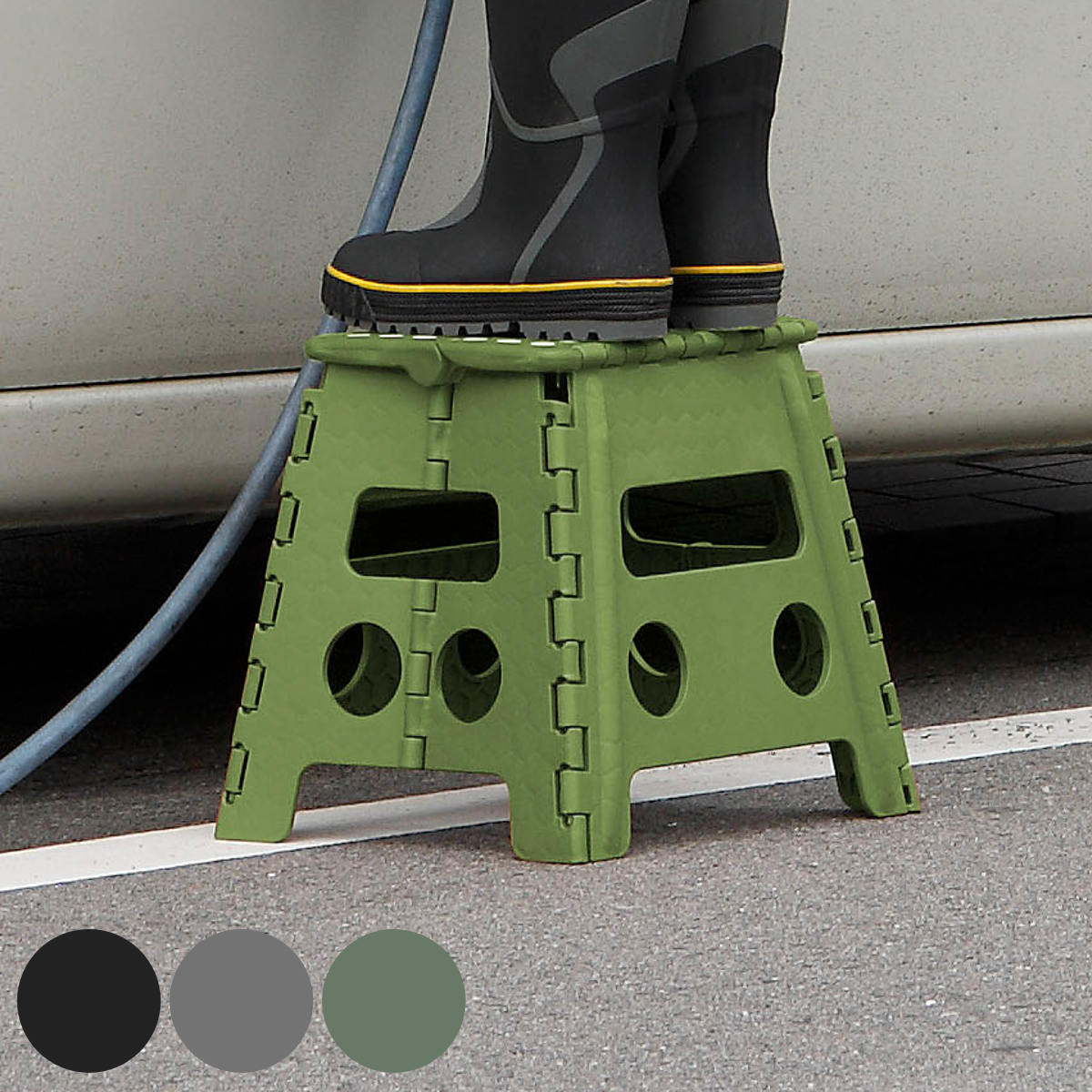 ちょっと高さが欲しい時にサッと取り出して使える踏み台です。軽量でコンパクトなので、片手で運べてどこへでも持ち出せます。室内で、戸棚の整理や電球替え、トイレや洗面所でお子様用に。屋外では洗車や植木の剪定、アウトドアなど、シーンを問わずに大活躍します。落ち着きのあるブラック、ダークグレー、オリーブの3色よりお好みのカラーをお選びいただけます。