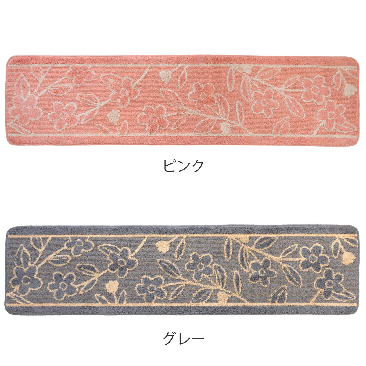 温かみあるデザインでキッチンをくつろぎ空間に●北欧調のフラワーモチーフがおしゃれな、ポリエステル製キッチンマット幅180cmです。