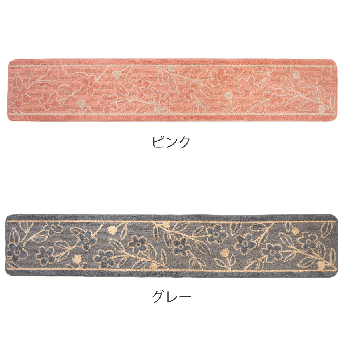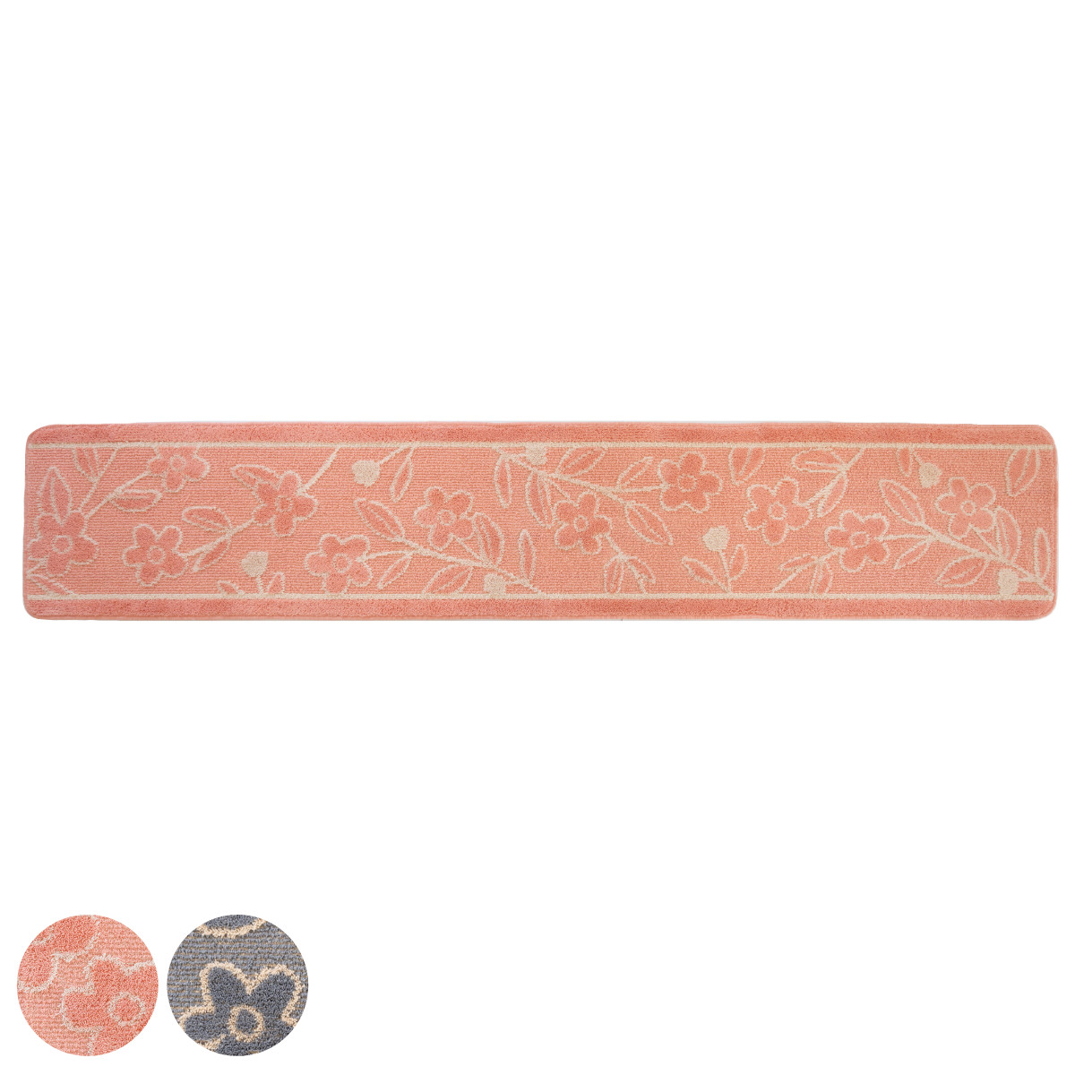 温かみあるデザインでキッチンをくつろぎ空間に●北欧調のフラワーモチーフがおしゃれな、ポリエステル製キッチンマット幅240cmです。