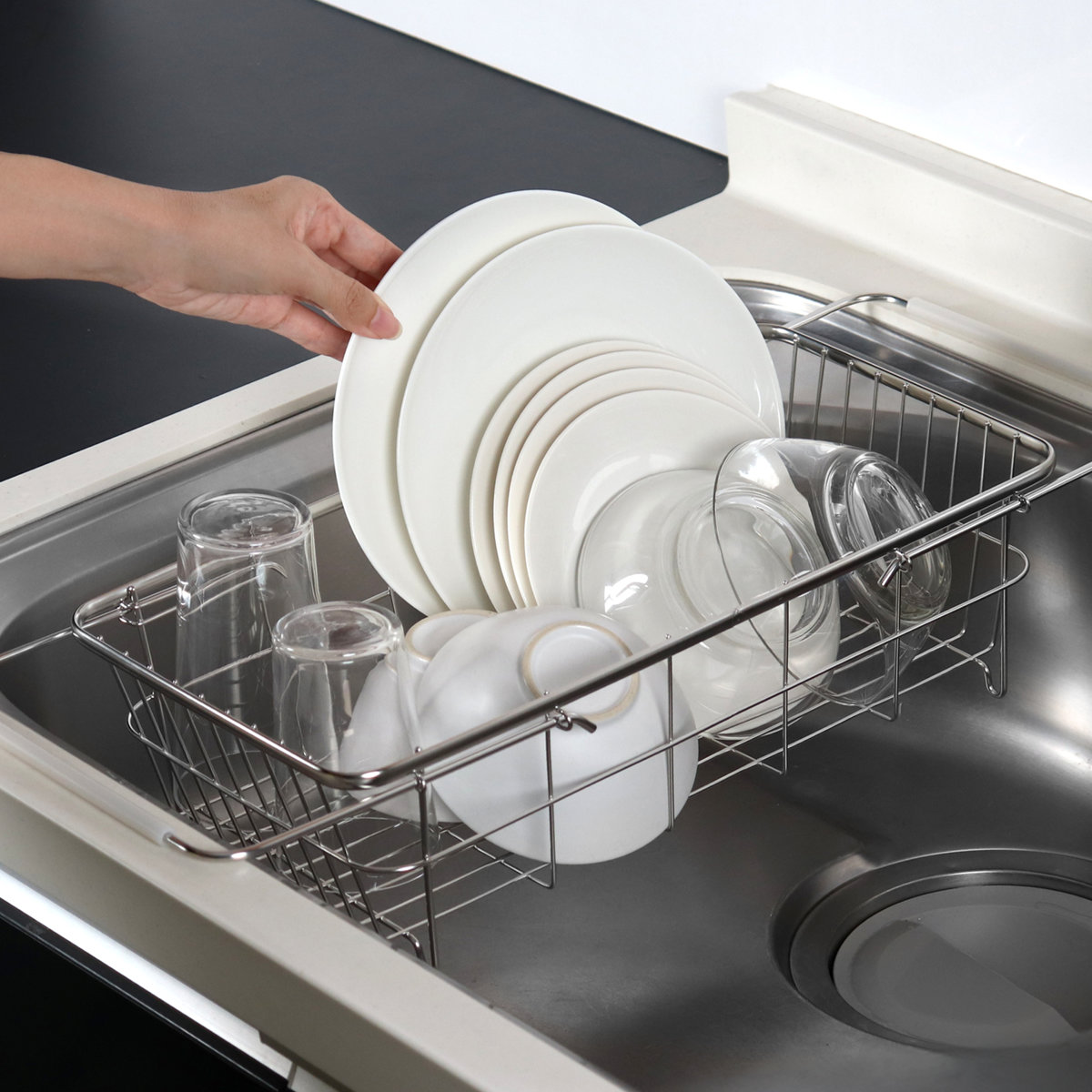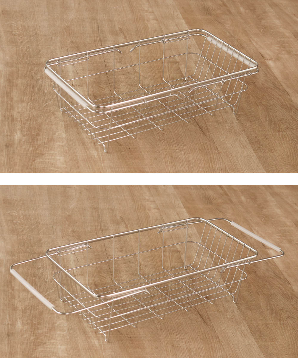 ●シンクのサイズに合わせて伸縮できる水切りバスケットです。