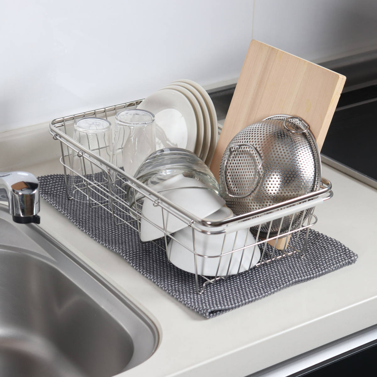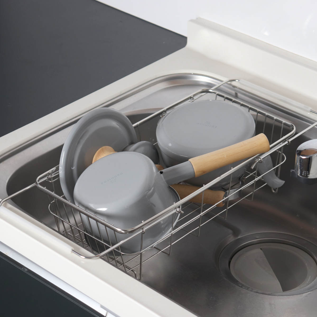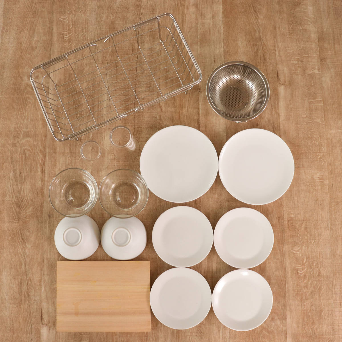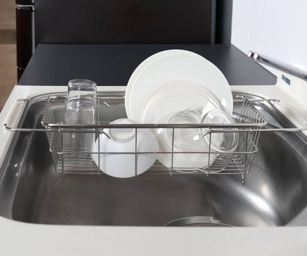2人分の食器がまとめて入るサイズです。少人数のご家庭では、食器に加えて鍋やフライパン、調理器具もまとめて収納できます。食洗機のサブ水切りとしても使えます。