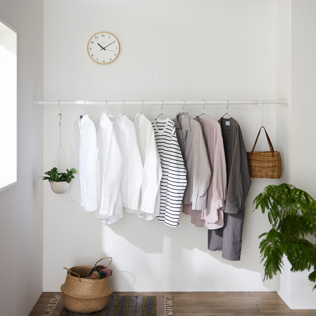 暮らしにフィットするシンプルな突っ張り棒シンプルなので様々なテイストに馴染むシンプルな突っ張り棒です。マットな質感のホワイトなので落ち着いた雰囲気になっています。お家の中のデットスペースを利用して収納力をアップできるので、クローゼットやキッチン、ランドリーなど様々な場所で大活躍してくれます。