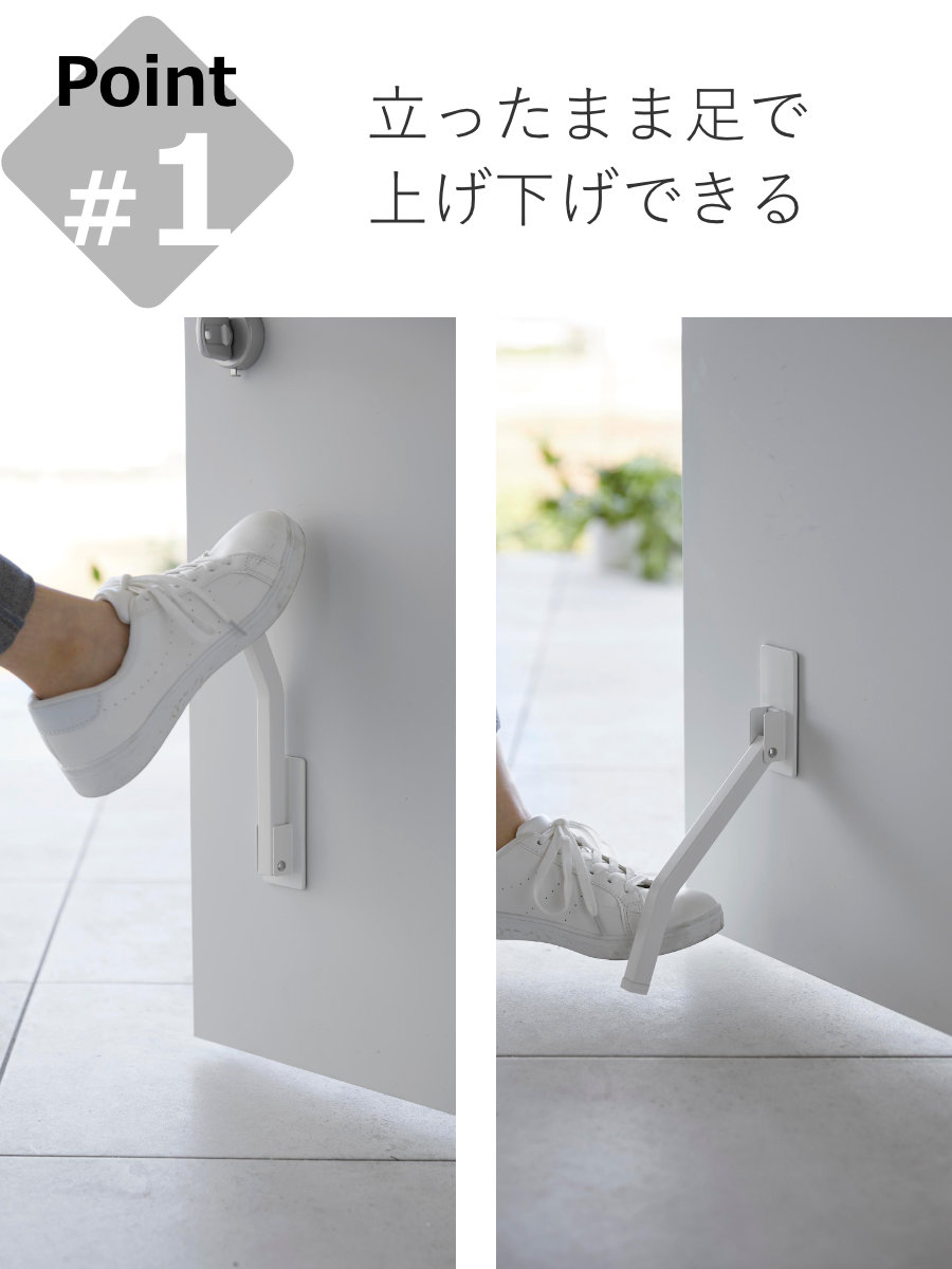 ●引っ掛かりがあるので片足でサッと押し下げるだけでドアを固定でき、戻す時も片足でラクラク収納できます。