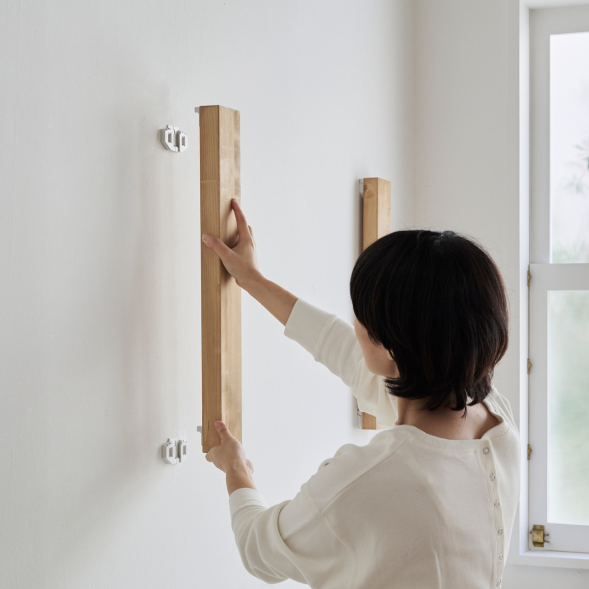 安全で簡単に利用出来るDIY収納パーツ 2本用柱材反り、曲がりの少ない1×4材/2×4材などを特別な技術がなくても、安全でカンタンに利用できるDIY収納パーツです。壁に小さなピンで柱材を取り付けられるブラケットです。柱材を浮かせて設置できます。