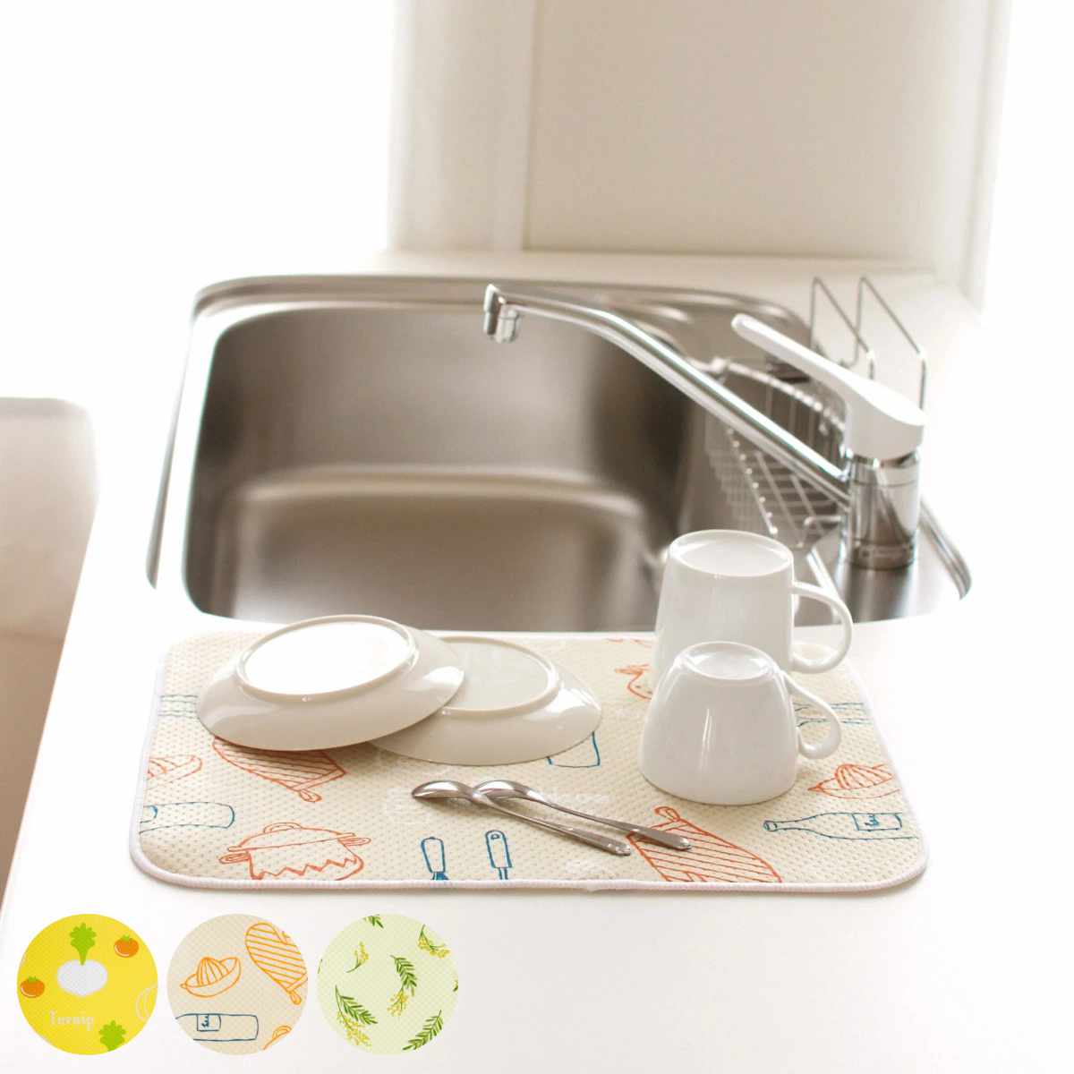 ちょっとした洗いものに便利な水切りマットちょっとした洗いものや、食洗機に入らなかった小物などを置くのに便利な薄手の水切り吸水マットです。キッチンが楽しくなるようなポップでカワイイ柄になっています。