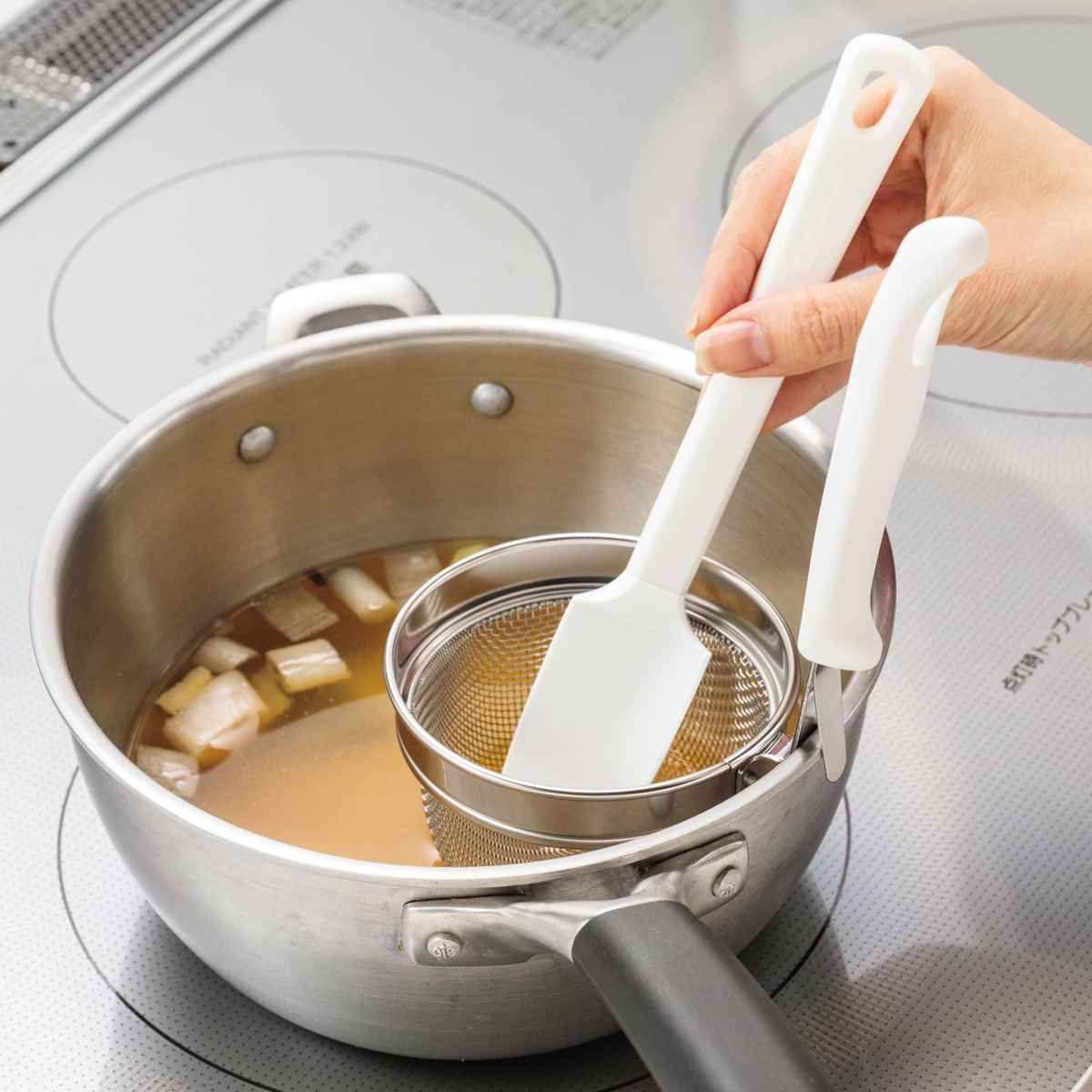 ●みそとき、みそこし、だし取りの際に便利な、シリコーンヘラ付きのみそこしセットです。