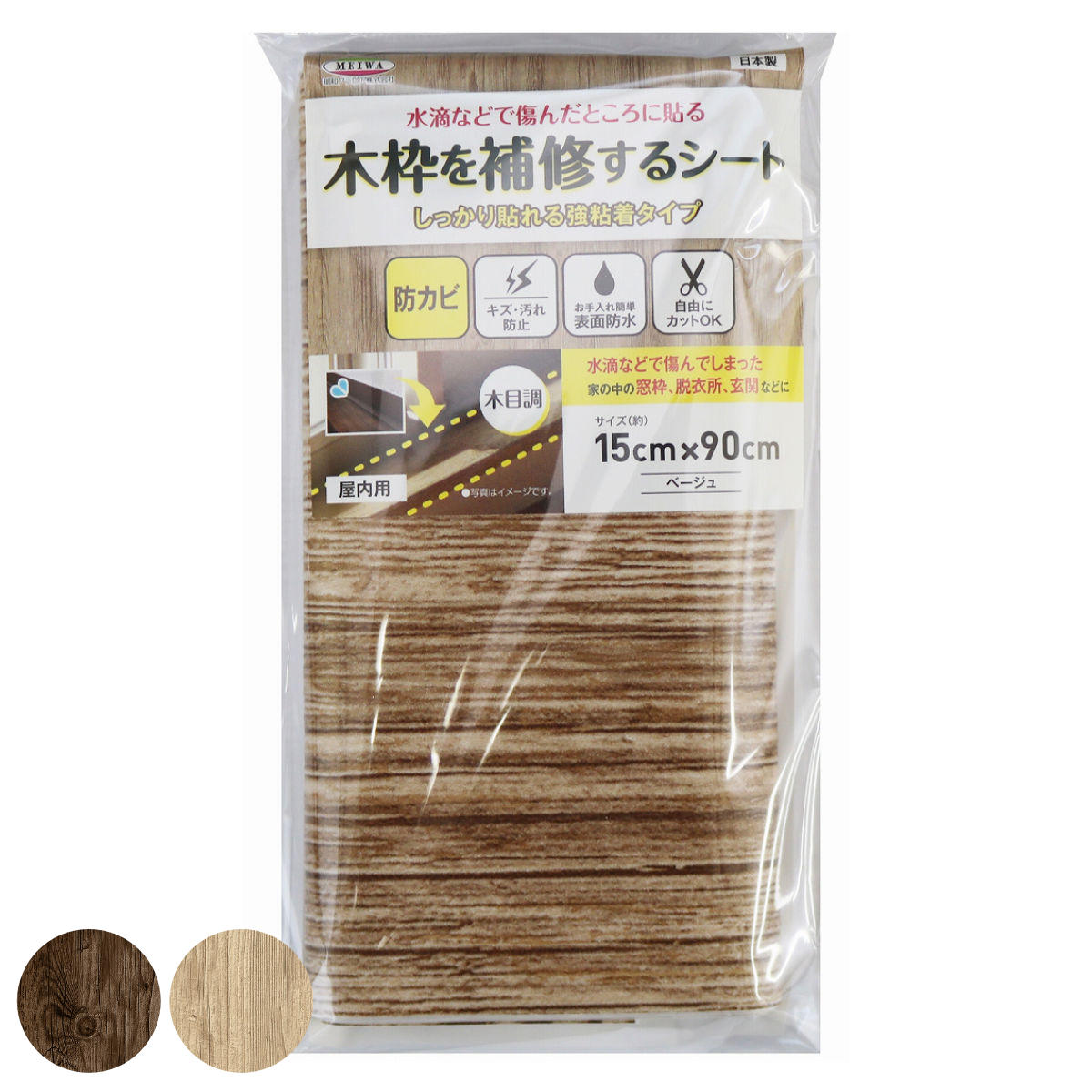 貼るだけで木枠を補修できるシート 15cm×90cm窓の結露や経年劣化による窓の木枠のカビ汚れや傷み、気になりませんか?水滴などで傷んだところに、貼るだけで木枠を補修できる便利なシートです。防カビ加工で衛生的、表面防水仕様でお手入れも簡単です。小窓や浴室の入口などにおすすめのサイズです。