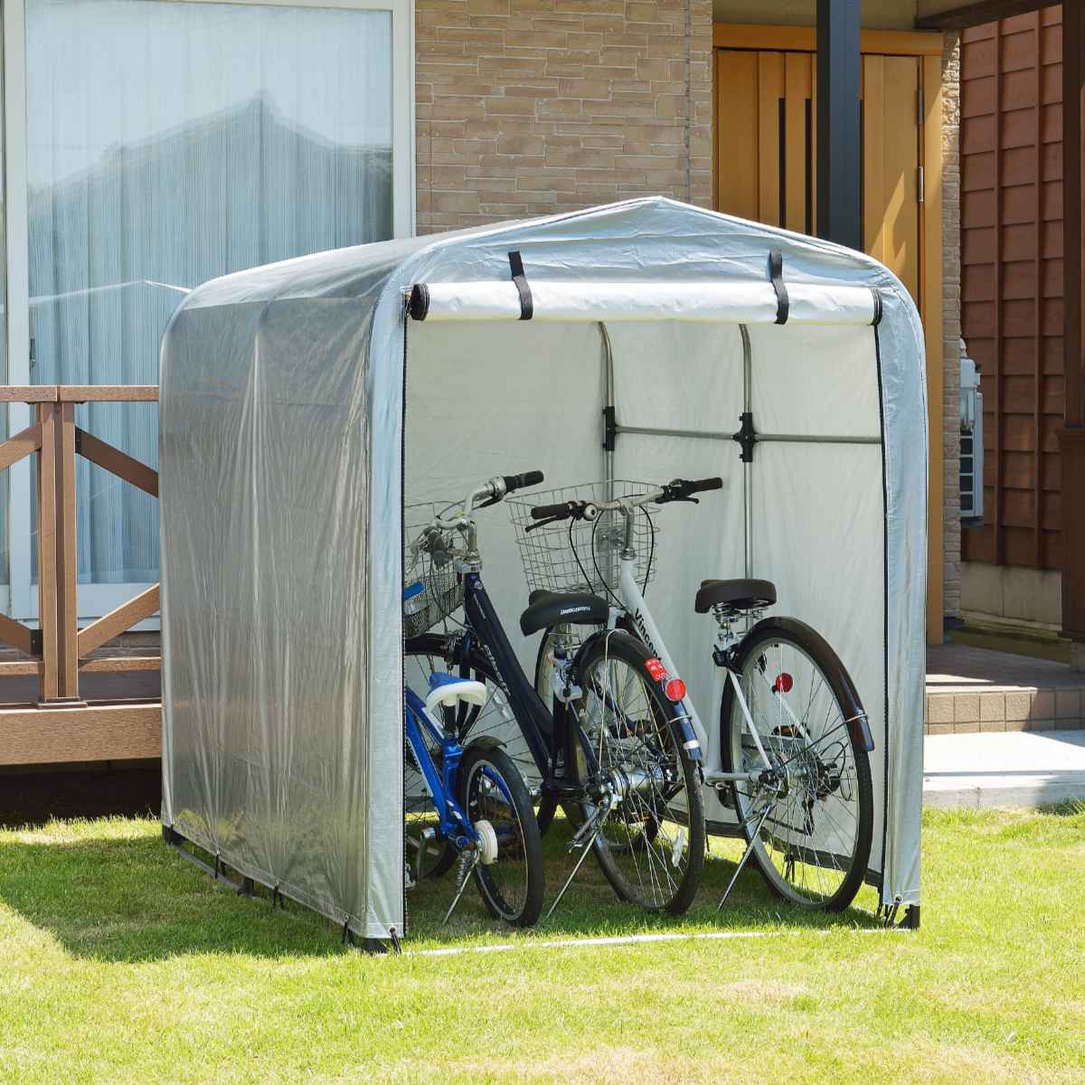 雨風や紫外線からしっかり守る簡易ガレージ 自転車2.5台用自転車やバイクの収納に便利な簡易ガレージです。テント型になっているので、置きたい場所に組み立てて簡単に設置できます。屋外に置いておくと汚れやサビ、劣化の原因になりますが、簡易ガレージは雨風や紫外線から収納物をしっかり守ります。