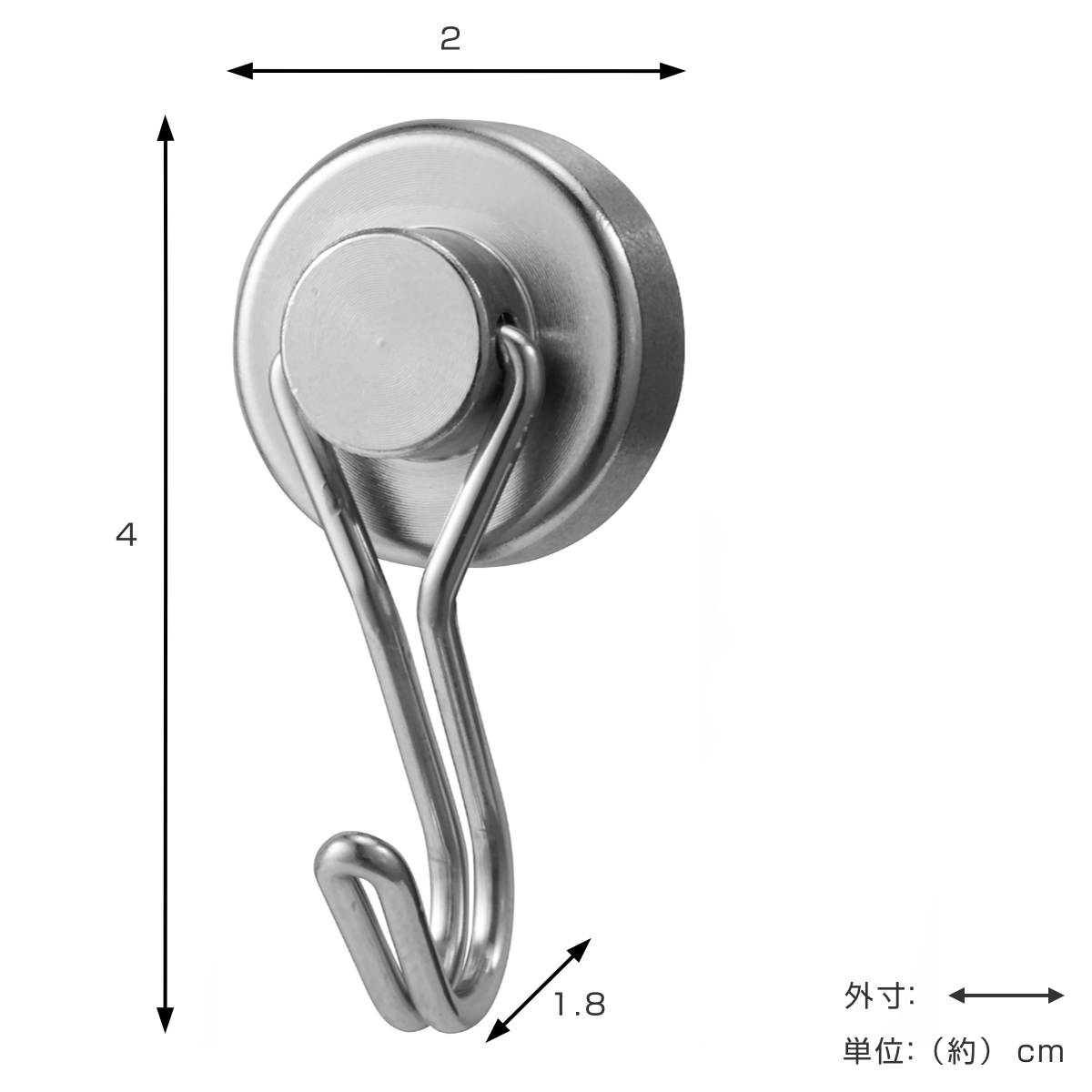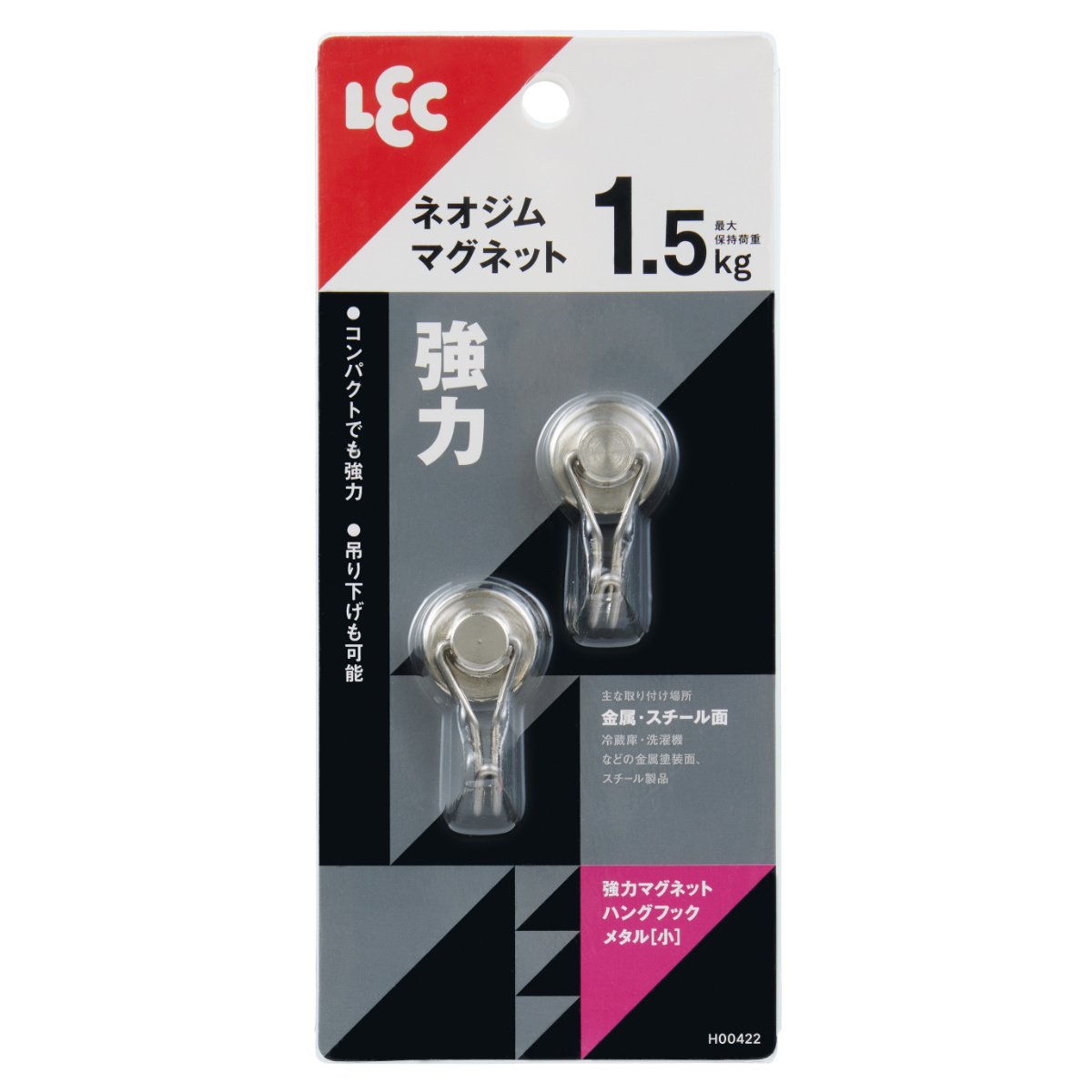 従来の磁石の10倍の磁力を持つネオジム磁石を使用●最大保持荷重が約1.5kgの、強力マグネットハングフック2個入りです。