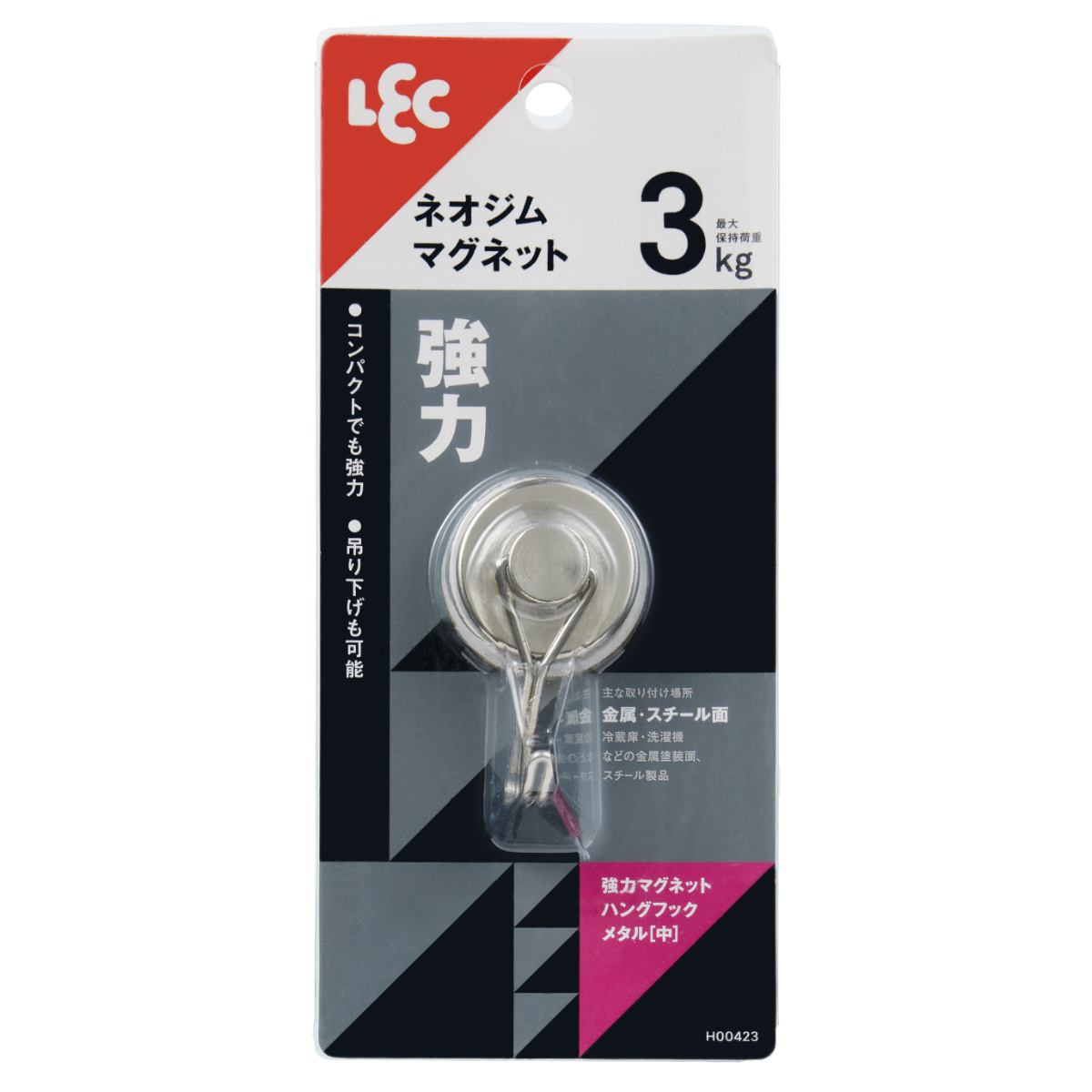 従来の磁石の10倍の磁力を持つネオジム磁石を使用●最大保持荷重が約3kgの、強力マグネットハングフックです。