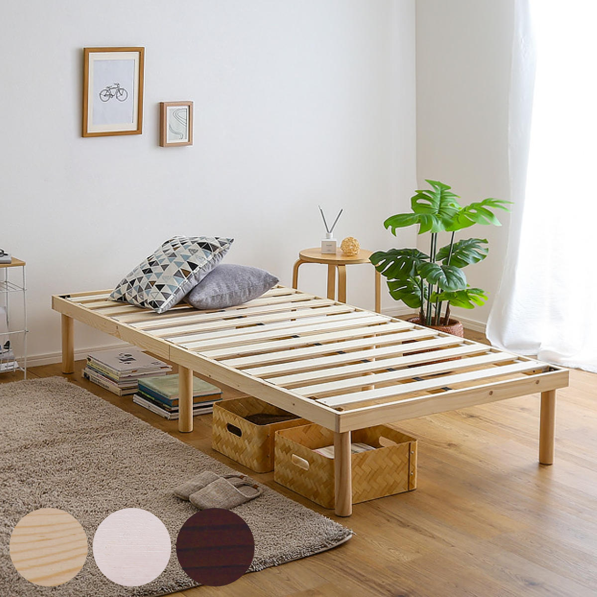 | 材質 | フレーム:天然木(パイン材) すのこ:積層合板(LVL) 表面材:ナチュラル/無塗装、ホワイトウォッシュ・ブラウン/ラッカー塗装 |