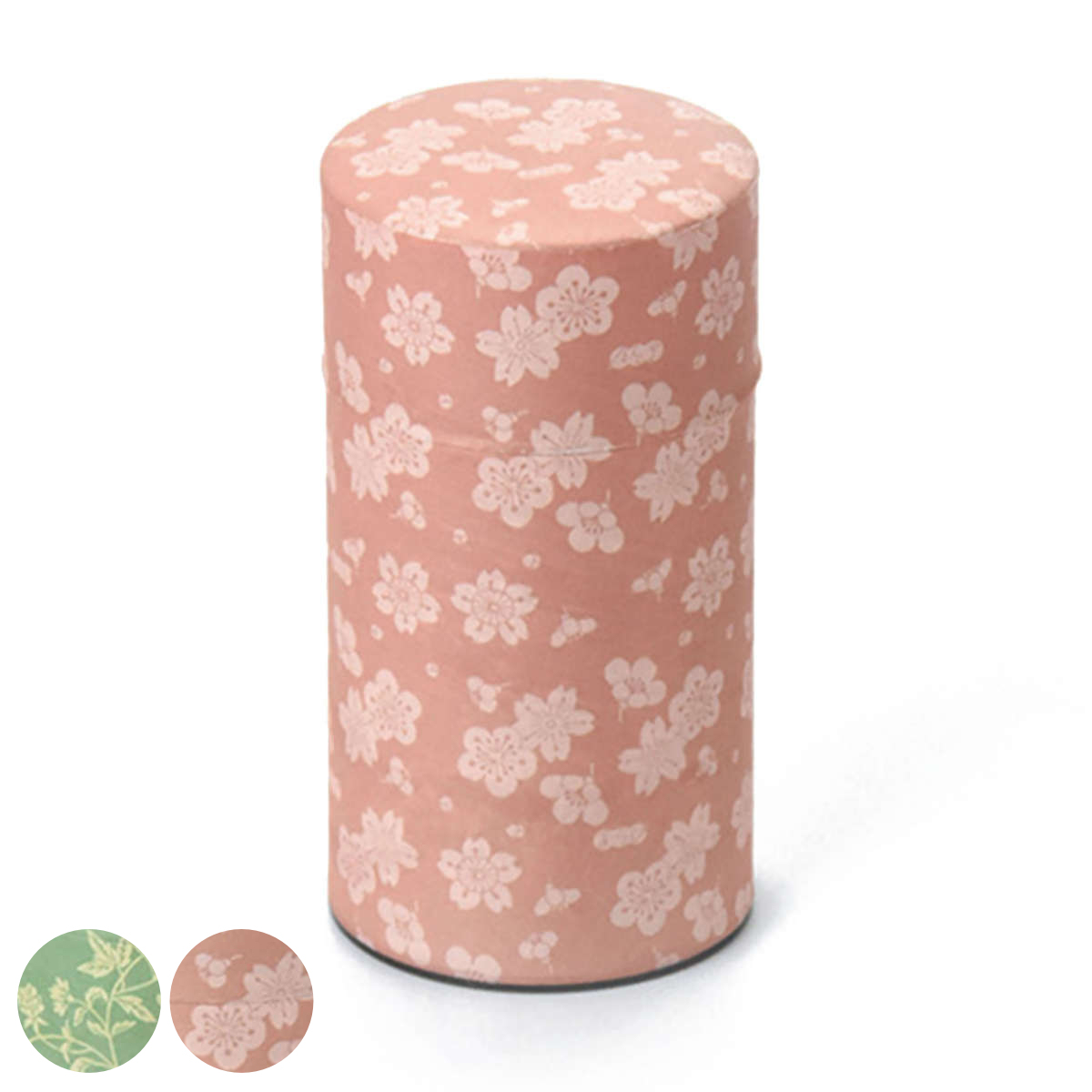 インテリアとして置いておいても様になる華やかなデザインの茶筒●表面に紙を巻いてデザインした茶筒、ぽッ・かんシリーズの花唐草と桜梅文柄の茶筒です。
