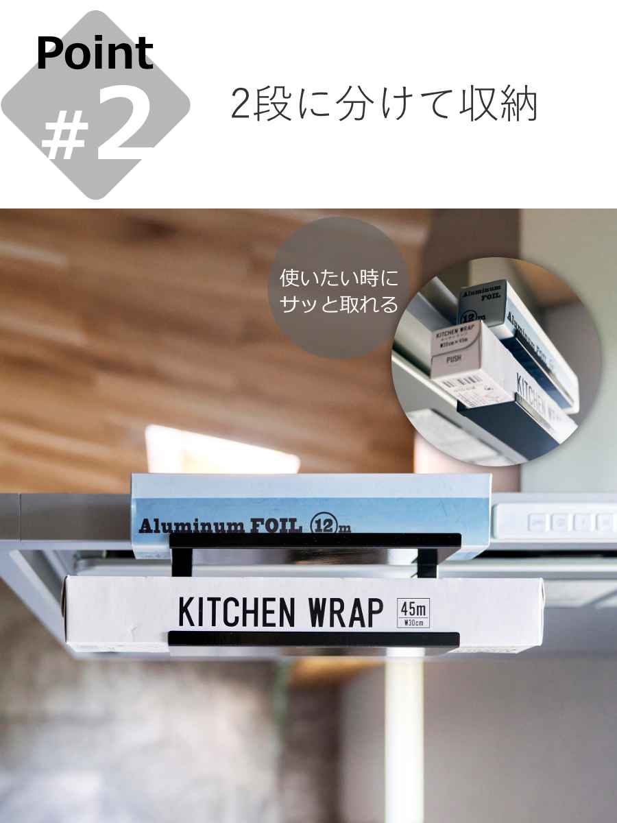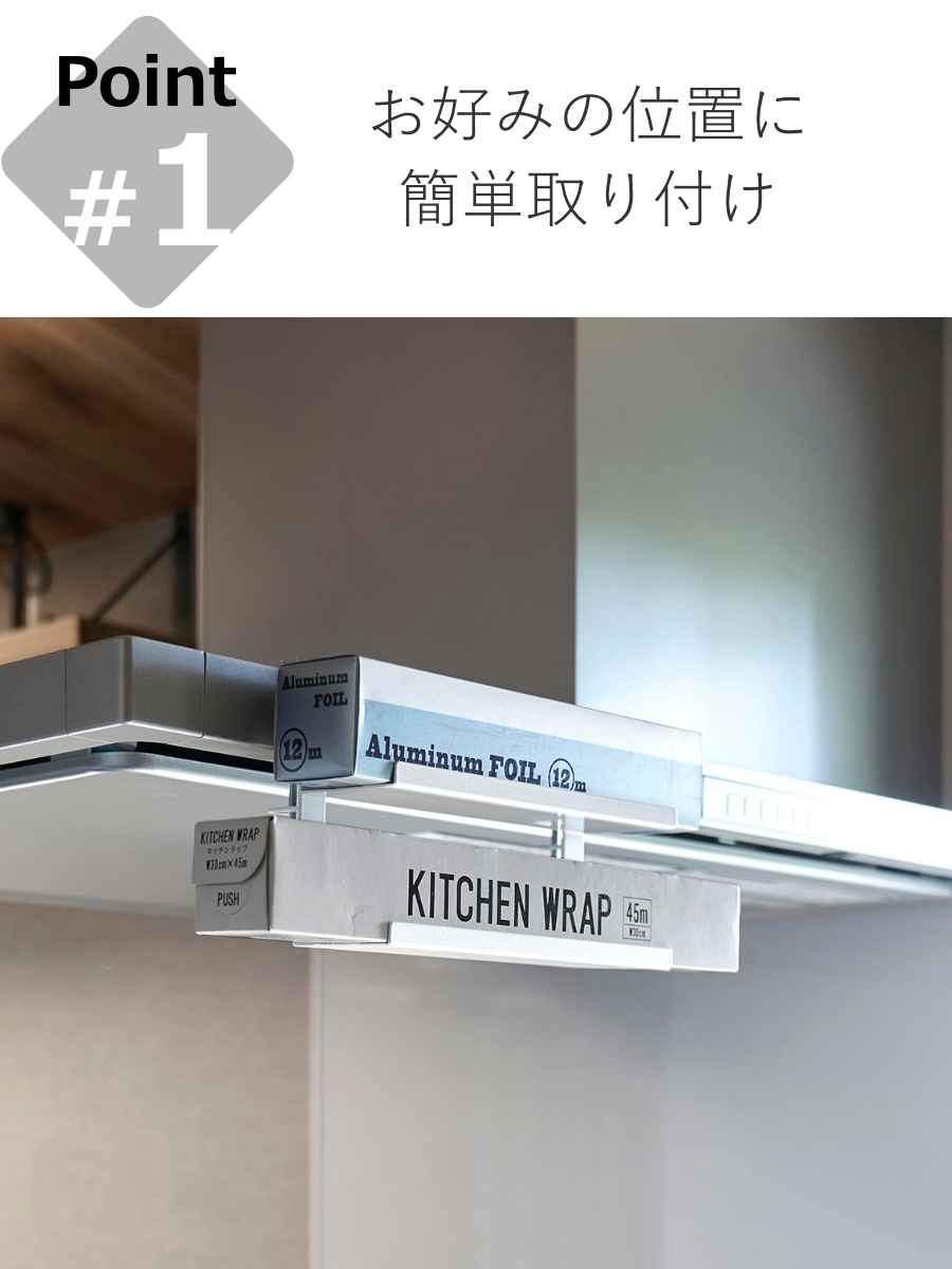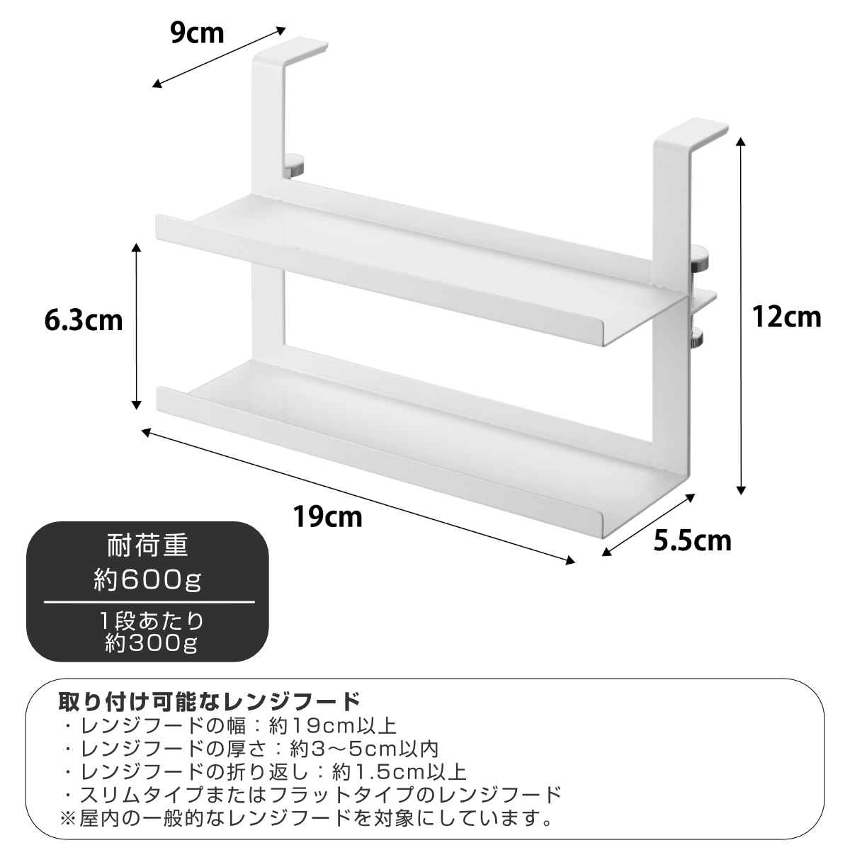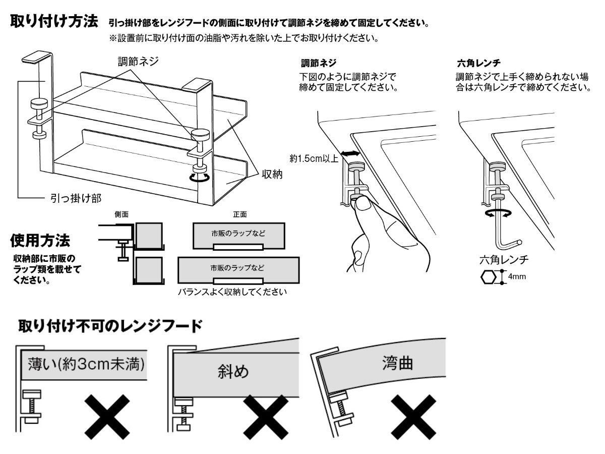 | 備考 | 【取り付け可能なレンジフード】 レンジフードの幅:約19cm以上 レンジフードの厚さ:約3〜5cm以内 レンジフードの折り返し:約1.5cm以上 スリムタイプまたはフラットタイプのレンジフード ※屋内の一般的なレンジフードを対象にしています。 |