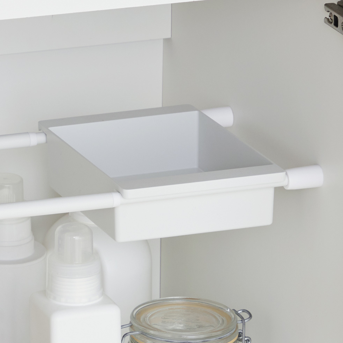 突っ張り棒にのせてスッキリ収納●突っ張り棒2本にのせてシンク下やデッドスペースなどに収納棚を設置できる収納ボックスです。